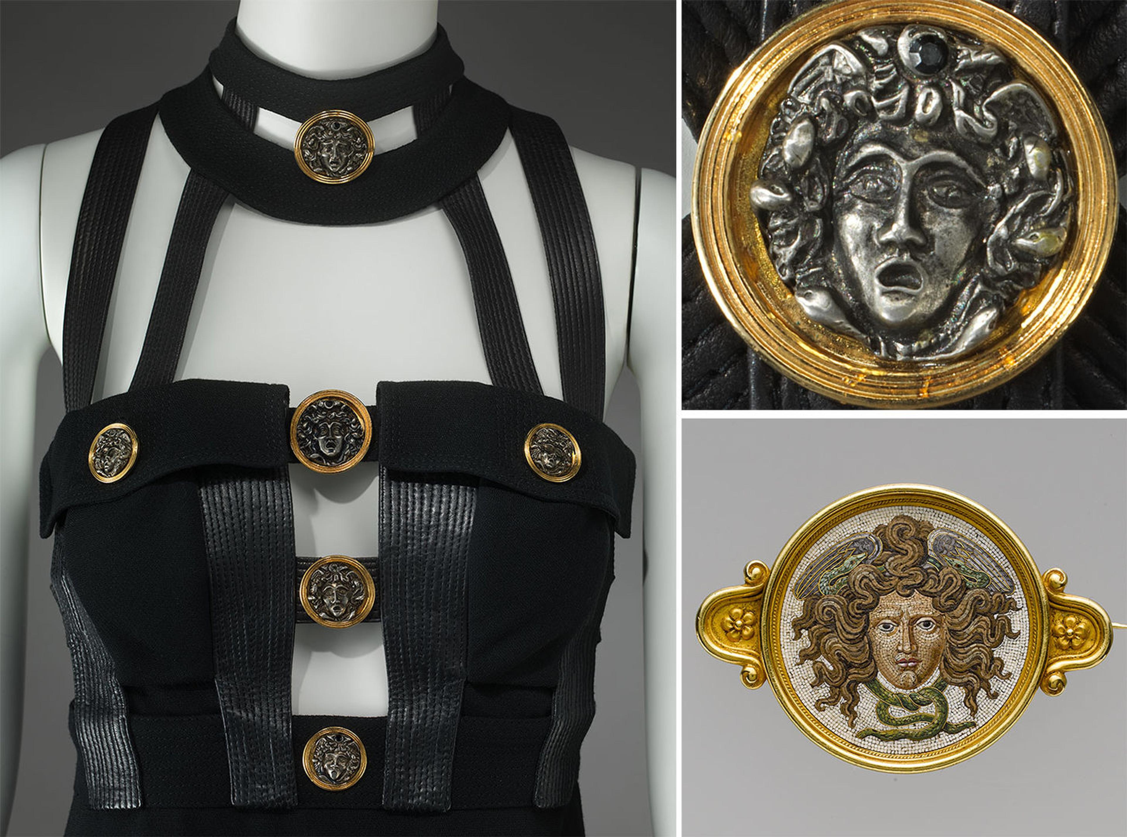 Clockwise from left: Gianni Versace (Italian, 1946–1997). Design House: Gianni Versace (Italian, founded 1978). Dress, fall/winter 1992–93. Wool/silk blend, leather, metal. The Metropolitan Museum of Art, New York, Gift of Barbara Rochelle Kaplan, 2004 (2004.65.1). Dress (detail). Brooch, before 1888. Firm of Castellani; mosaic possibly by Luigi Podio. Italian. Glass micromosaic, gold, 1 1/2 x 2 1/4 in. (3.8 x 7.1 cm). The Metropolitan Museum of Art, New York, Gift of Jacqueline Loewe Fowler, 2007 (2007.299.1)