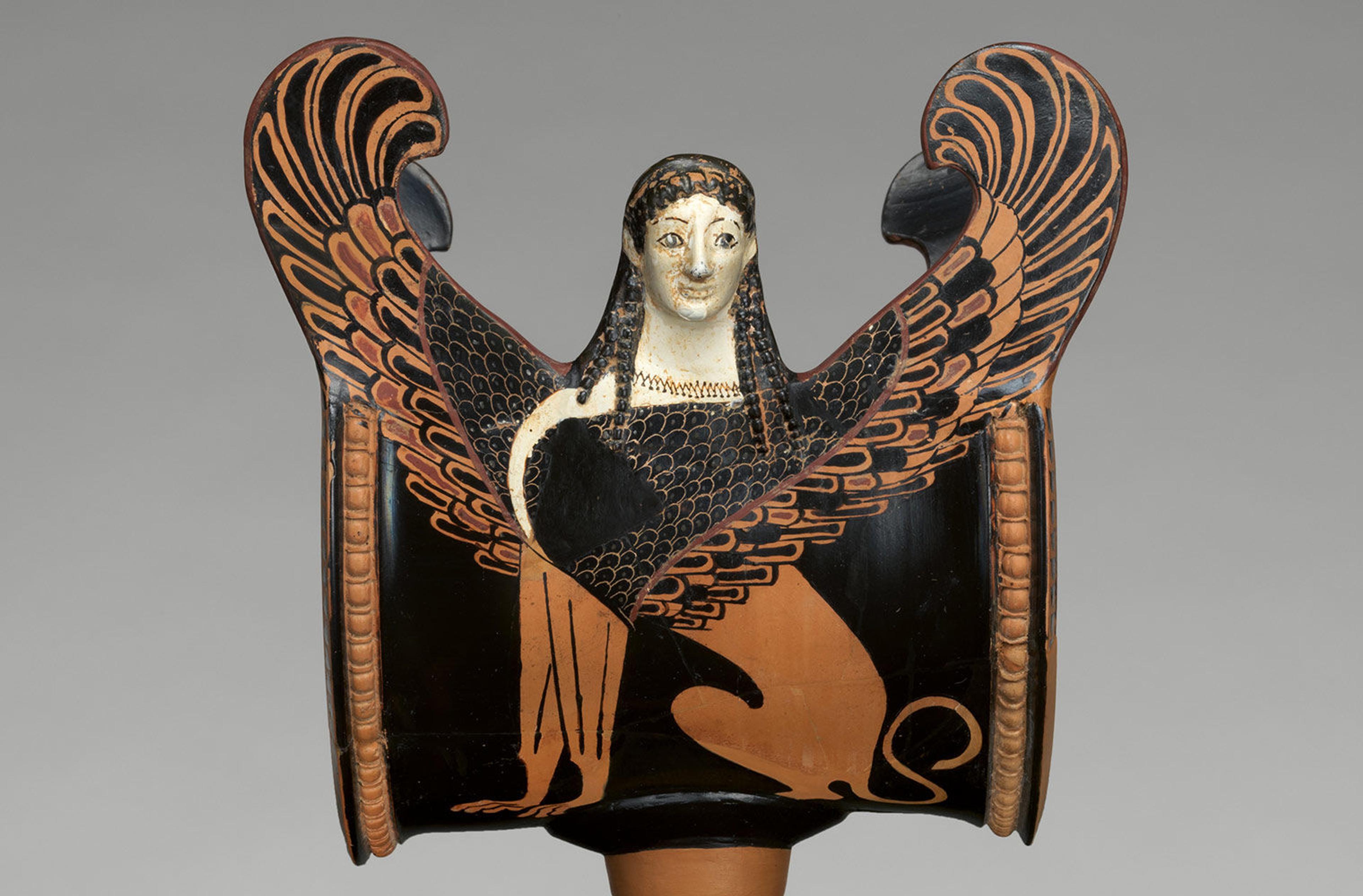 Terracotta stand with sphinx, ca. 520 B.C. Greek (Attic), Archaic. Terracotta; red-figure, H. 10 1/4 in. (26 cm). The Metropolitan Museum of Art, New York, Gift of Mr. and Mrs. Norbert Schimmel, 1980 (1980.537)