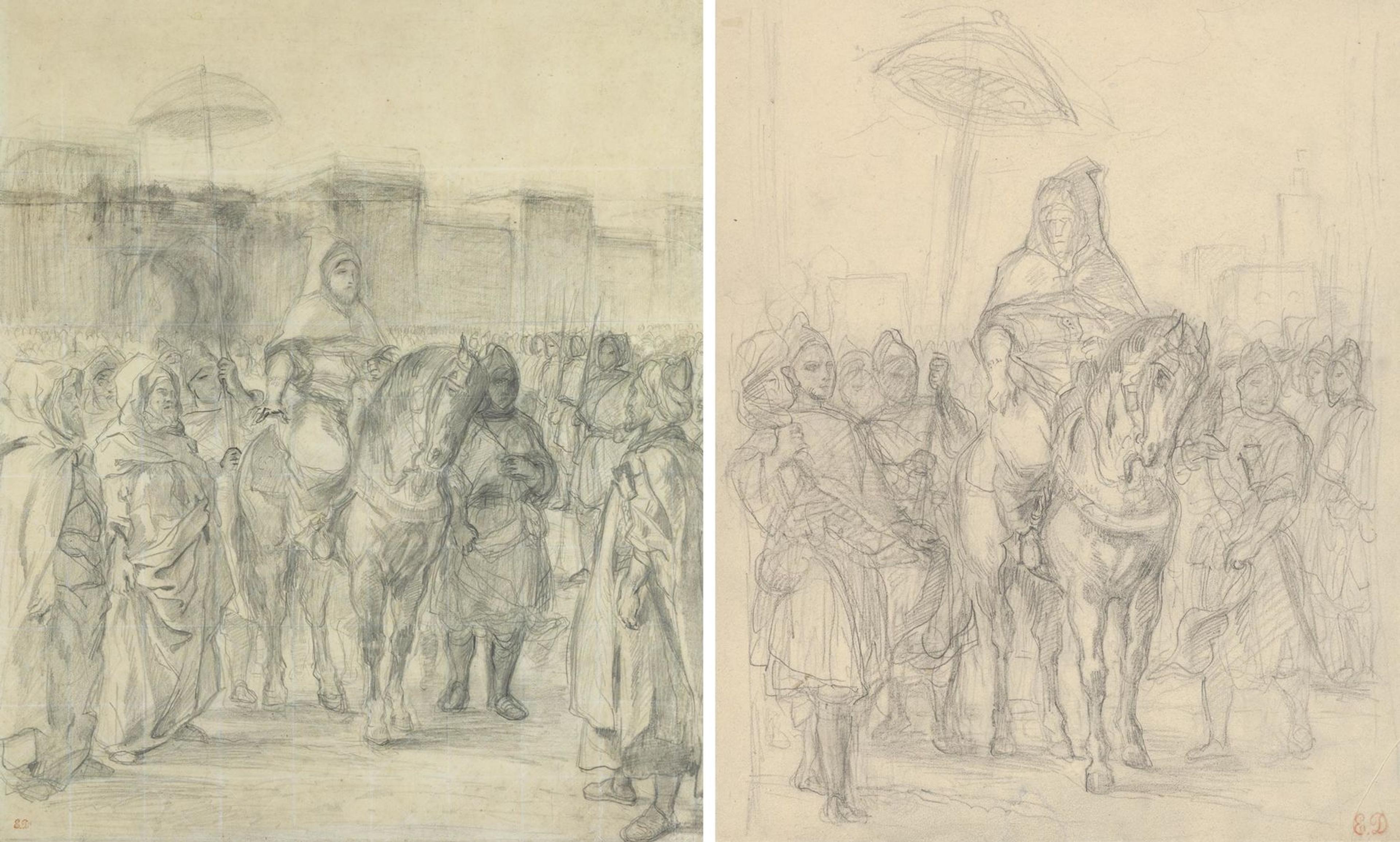 Left: Study for The Sultan of Morocco and His Entourage, 1845. Graphite, squared in white chalk, sheet: 23 1/2 x 19 9/16 in. (59.7 x 49.7 cm). The Metropolitan Museum of Art, New York, Rogers Fund, 1961 (61.202). Right: Study for The Sultan of Morocco and His Entourage, ca. 1855–56. Graphite, 8 1/4 x 10 1/8 in. (20.9 x 25.7 cm). The Metropolitan Museum of Art, New York, Gift from the Karen B. Cohen Collection of Eugène Delacroix, in honor of Henri Loyrette, 2013 (2013.1135.21)