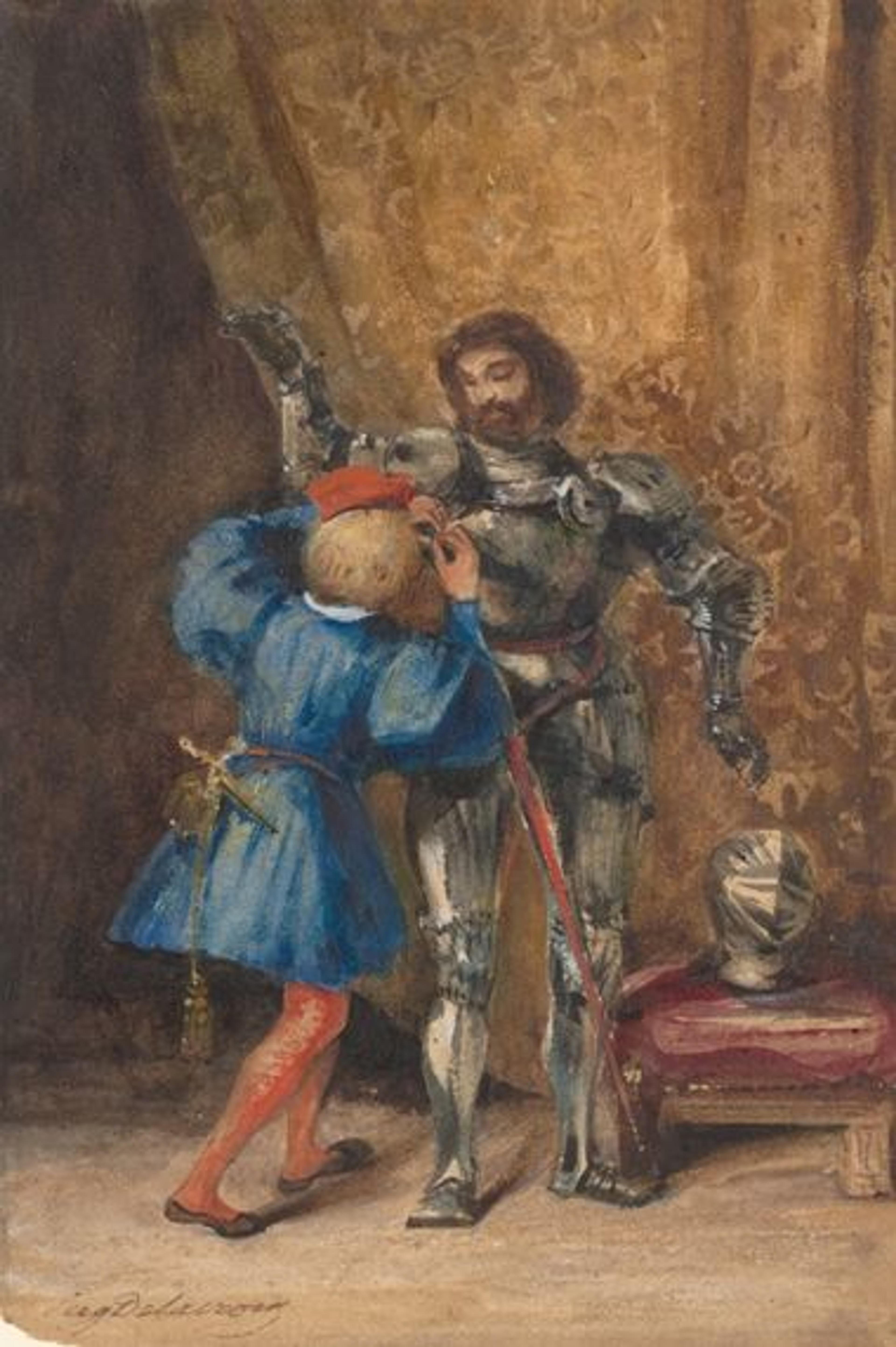 Left: Eugène Delacroix (French, 1798–1863). Goetz von Berlichingen Being Dressed in Armor by His Page George, 1826–27. Watercolor and bodycolor with gum arabic on wove paper, 8 3/8 x 5 5/8 in. (21.3 x 14.3 cm). The Metropolitan Museum of Art, New York, Gift from the Karen B. Cohen Collection of Eugène Delacroix, in honor of Thomas P. Campbell, 2014 (2014.732.2)
