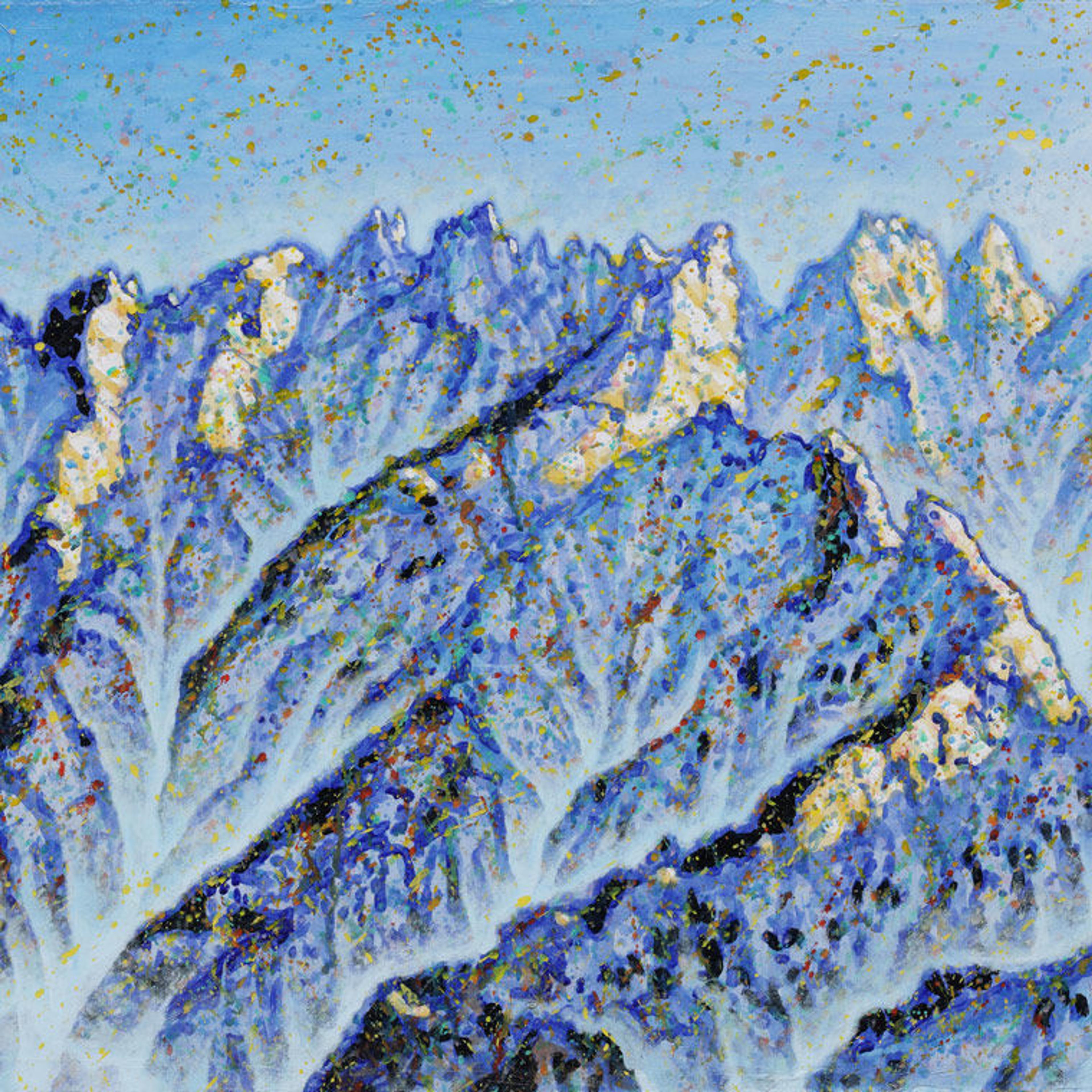 In 2014 he painted a series of twelve scenes depicting various sites within the mountains in the four seasons. The Light at Cheonhwadae captures the brilliant sunlight reflected off the snowcapped peaks. Shin, who trained in Western techniques, typically uses acrylic on canvas (or on Korean mulberry paper over canvas), capturing the effervescence and luminosity of the landscape in bright colors.