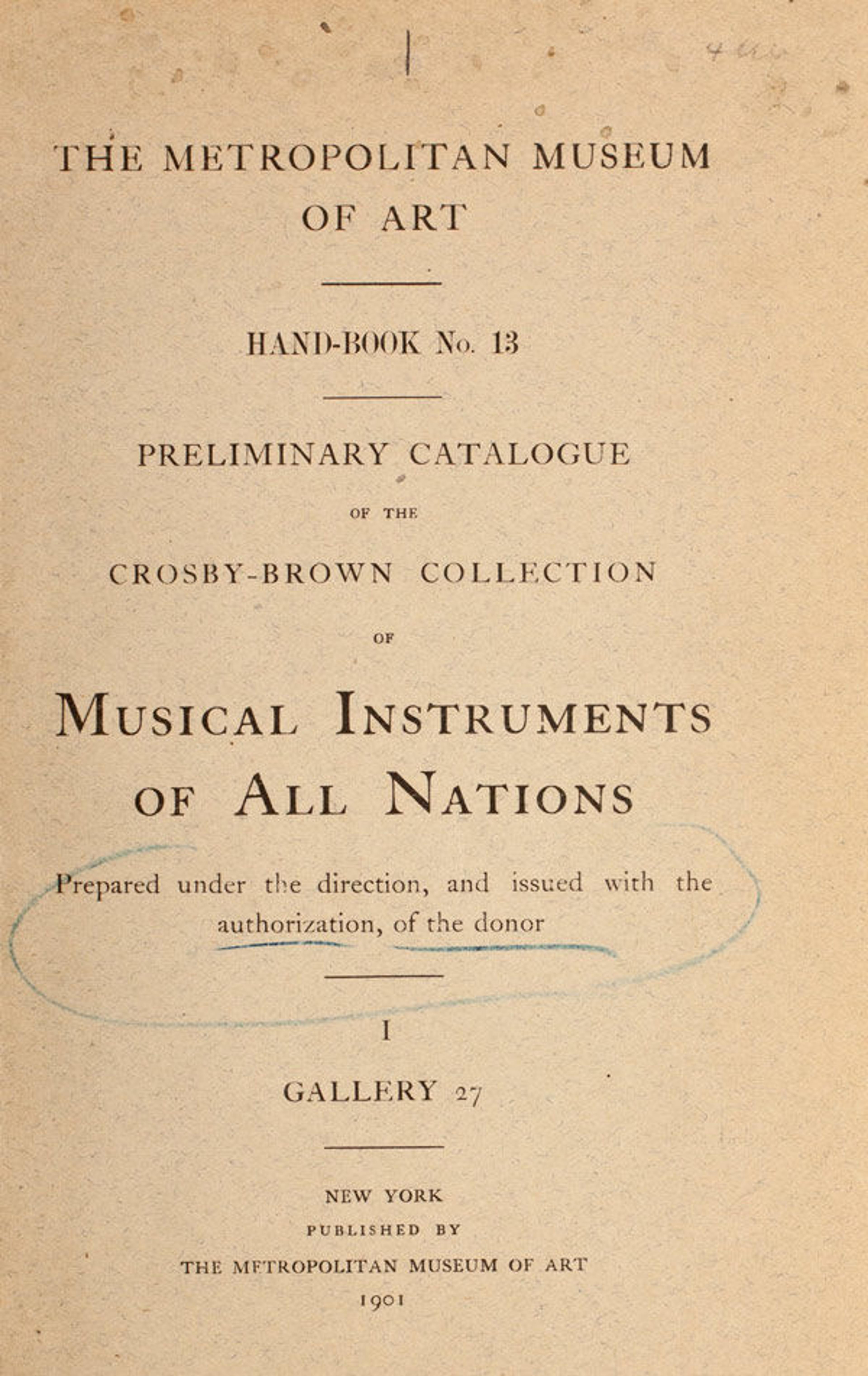 Title page from Preliminary Catalogue of the Crosby-Brown Collection of Musical Instruments of All Nations: [Volume] I, Gallery 27, the first catalogue of the Crosby Brown Collection of Musical Instruments to be published by The Metropolitan Museum of Art, 1901