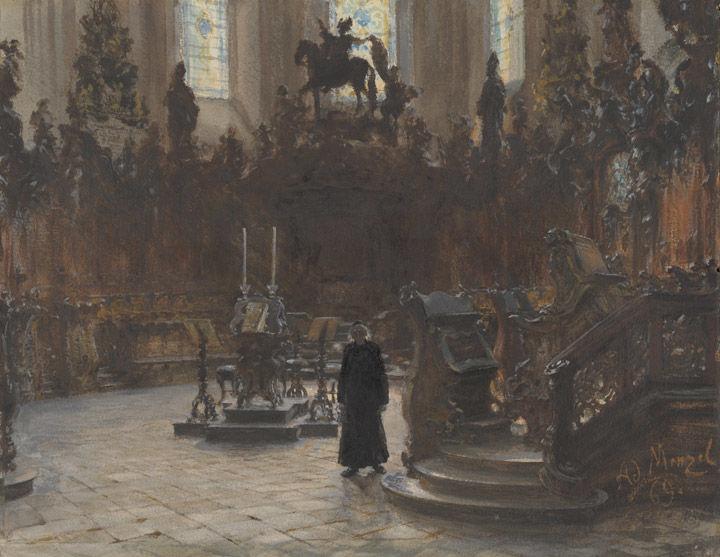 Adolph von Menzel (German, 1815–1905). The Choirstalls in the Mainz Cathedral, 1869. Watercolor and gouache (with gum arabic), framing line in graphite, Sheet: 8 7/8 x 11 3/8 in. (22.6 x 28.9 cm). The Metropolitan Museum of Art, New York, Purchase, 2006 Benefit Fund, 2007 (2007.169)