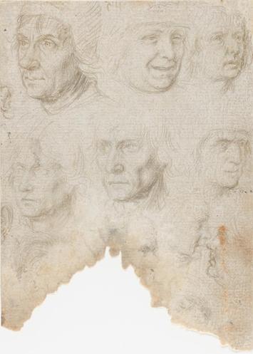 Right: Gerard David (Netherlandish, ca. 1455–1523). Studies of Ten (?) Heads and Two Ears, ca. 1498. Metalpoint on prepared paper, Sheet: 5 1/4 x 3 3/4 in. (13.3 x 9.5 cm). The Metropolitan Museum of Art, New York, Purchase, Lila Acheson Wallace Gift, 2008 (2008.368a, b)