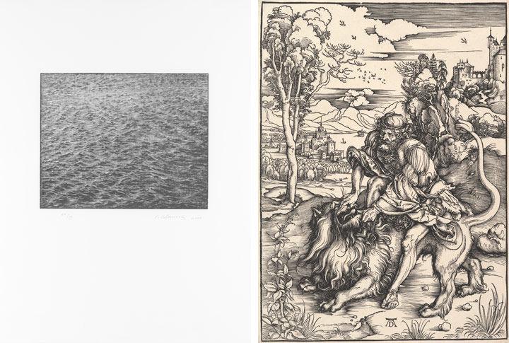 Left: Vija Celmins (American, born Riga, Latvia, 1938). Ocean Surface Wood Engraving 2000, 2000. Wood engraving, Sheet: 20 3/4 x 17 1/4 in. (52.7 x 43.8 cm); Plate: 8 1/4 x 10 1/4 in. (21 x 26 cm). The Metropolitan Museum of Art, New York, Purchase, Catherine Woodard and Nelson Blitz Jr. Gift, in honor of their daughters, Perri and Allison Blitz, 2002 (2002.127). Right: Albrecht Dürer (German, 1471–1528). Samson Rending the Lion, ca. 1497–98. Woodcut, Sheet: 16 x 11 7/8 in. (40.6 x 30.2 cm). The Metropolitan Museum of Art, New York, Gift of Georgiana W. Sargent, in memory of John Osborne Sargent, 1924 (24.63.111)