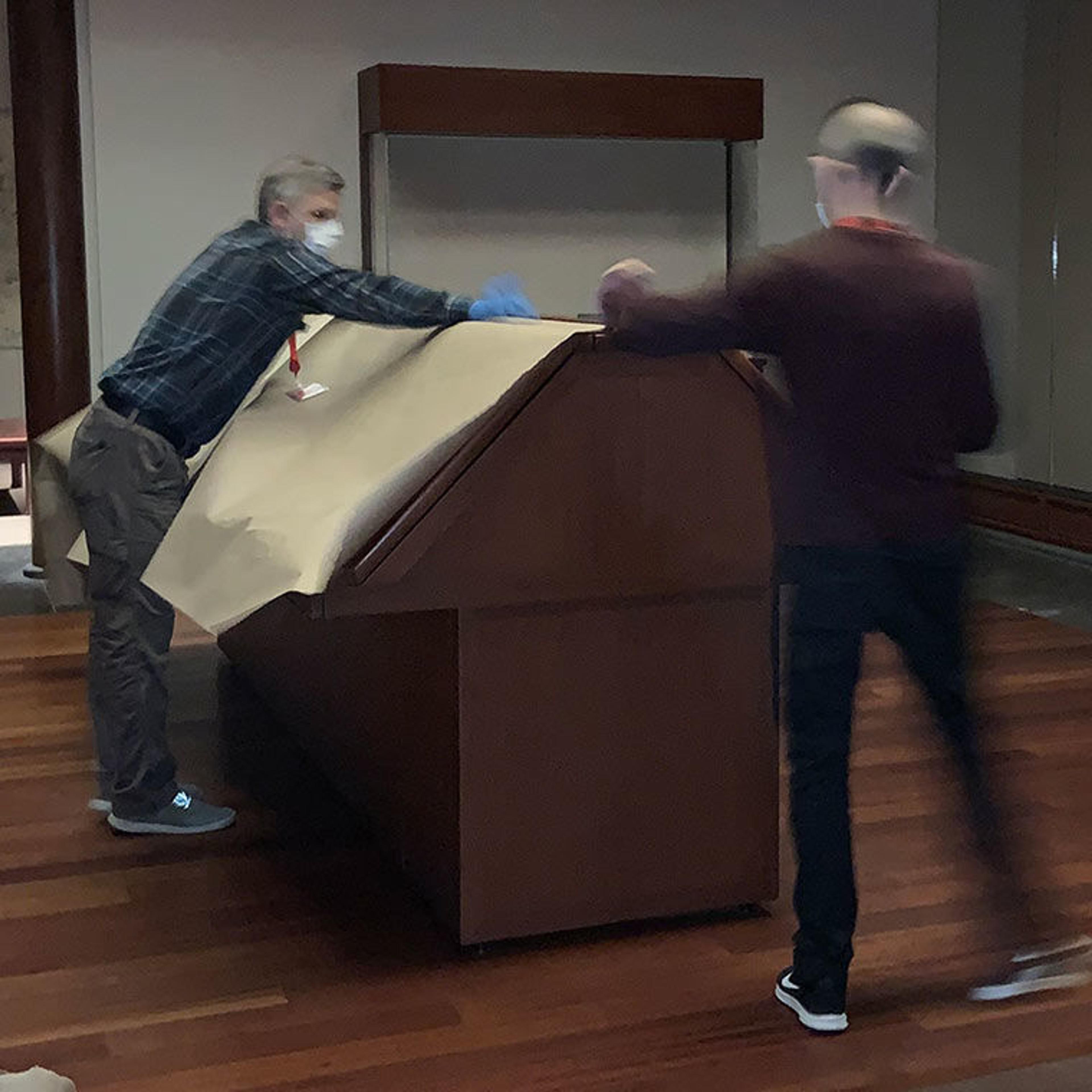 Collection Monitors Ted Hunter, Jim Moske and Jennifer Perry in the Asian Art galleries, March 28, 2020. Photograph by Meredith Reiss