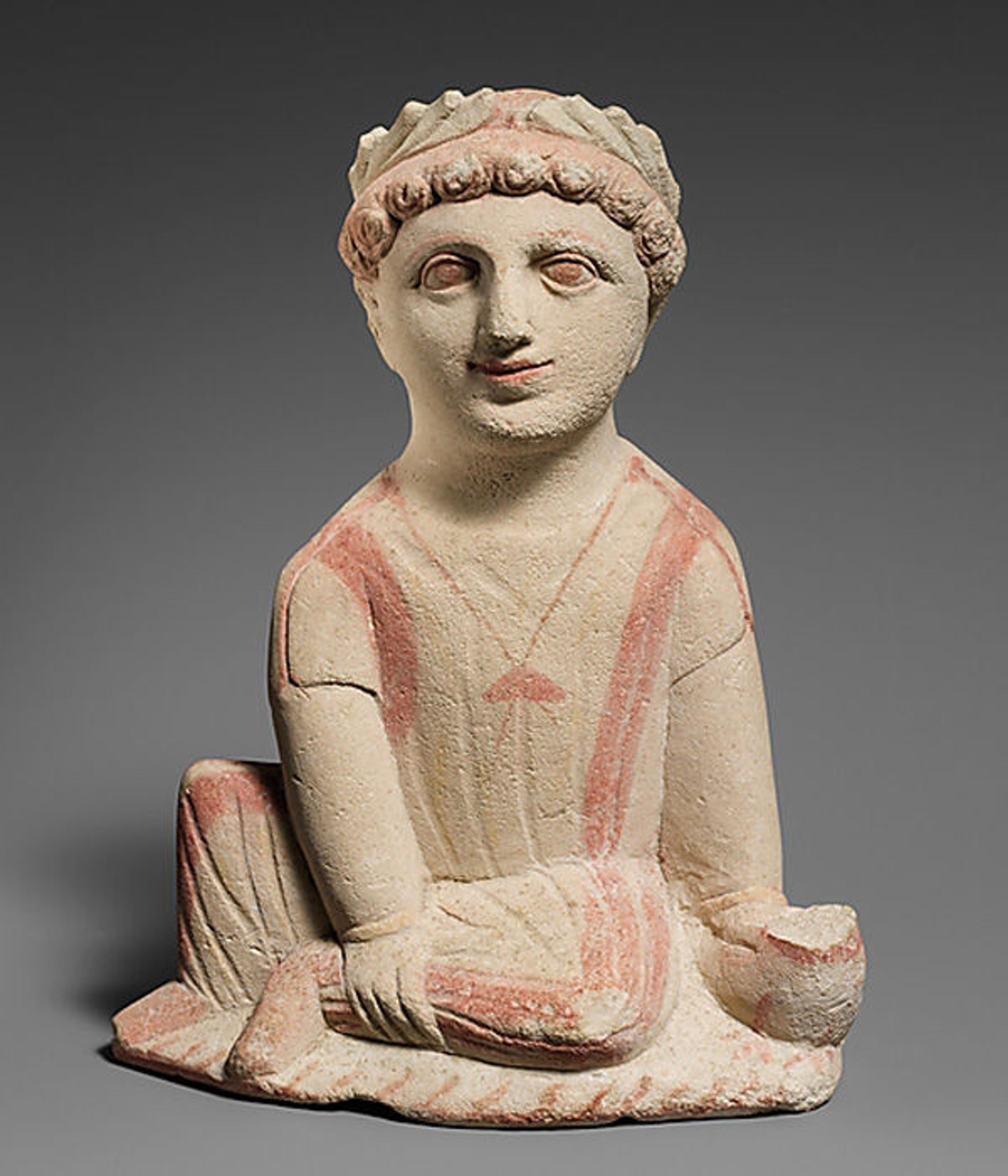 The original surface decoration is still visible on many Cypriot sculptures like this one because limestone is more porous than marble. Limestone statuette of a temple boy, ca. 350–300 B.C. Cypriot. Limestone; 9 1/4 x 7 x 2 1/2 in. (23.5 x 17.8 x 6.4 cm). The Metropolitan Museum of Art, New York, The Cesnola Collection, Purchased by subscription, 1874–76 (74.51.2760)