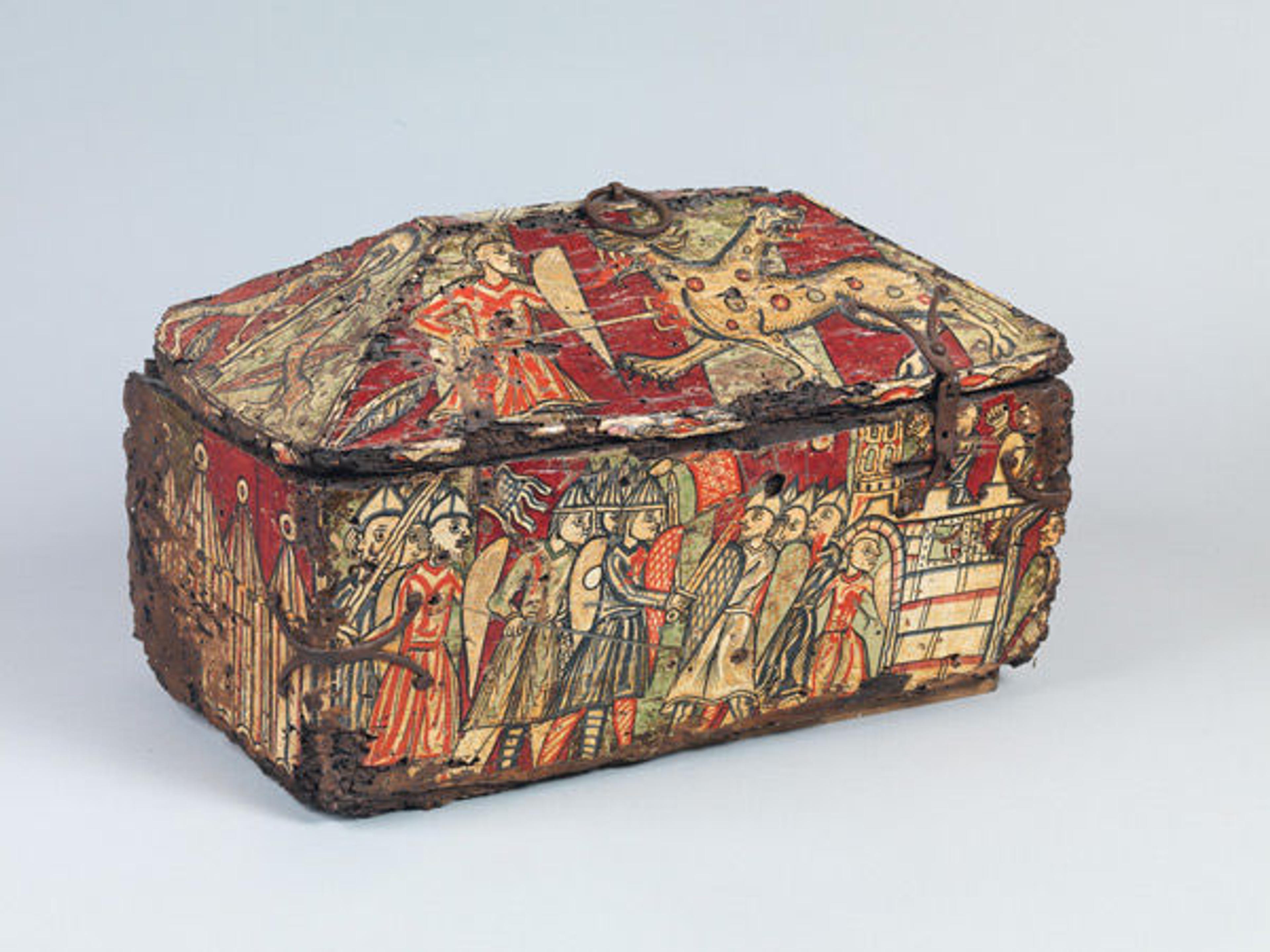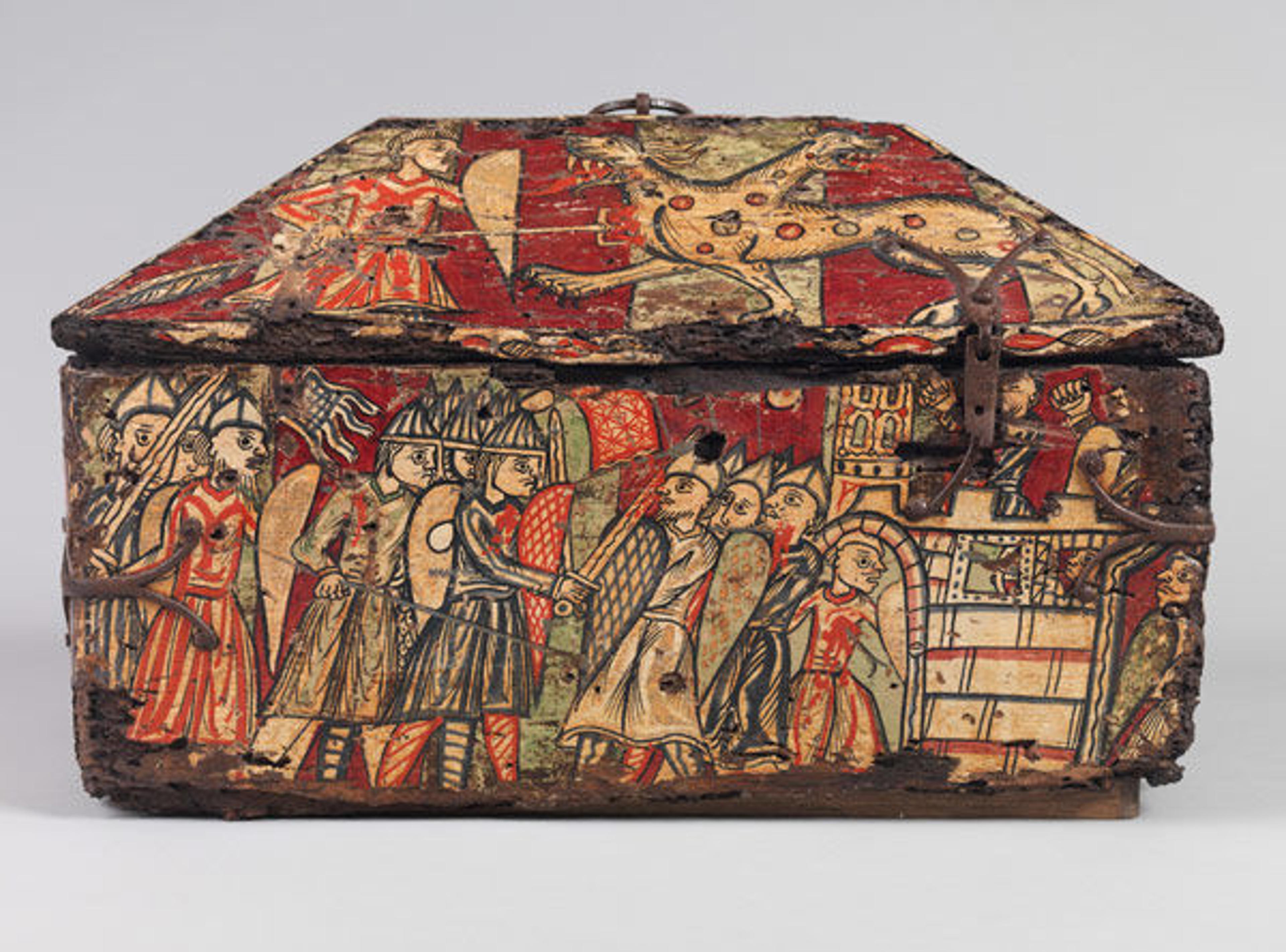 Painted wood box with the Legend of Guilhem of Orange, about 1200–1225. Southern France. Walnut, paint, and iron mounts. Private Collection, United Kingdom