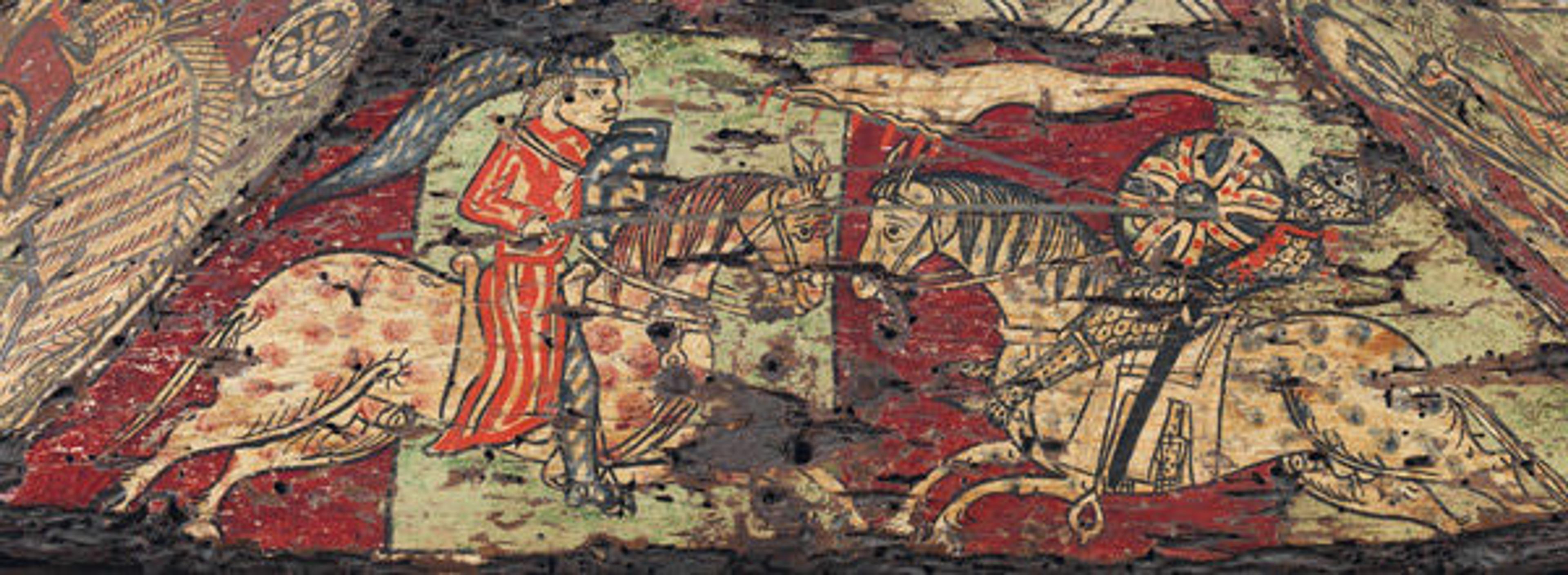 Detail of the sloping back lid of the painted wood box with the Legend of Guilhem of Orange showing the worthy opponents, Saracen Prince Aragon and Count Bertrand, in battle