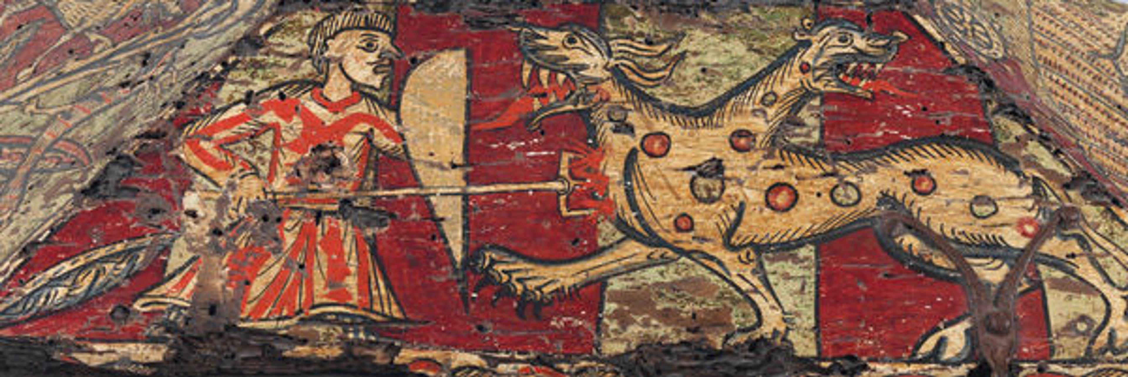 Detail of the sloping back lid of the painted wood box with the Legend of Guilhem of Orange showing Guilhem stabbing a two-headed beast