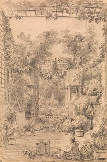 Fragonard's drawings tell us more about his working process than his personal life. Left: Jean Honoré Fragonard (French, 1732–1806). Draftsman in a Trellised Garden, ca. 1770–72. Black chalk, 14 15/16 x 9 13/16 in. (38 x 25 cm). The Metropolitan Museum of Art, New York, Robert Lehman Collection, 1975 (1975.1.626)