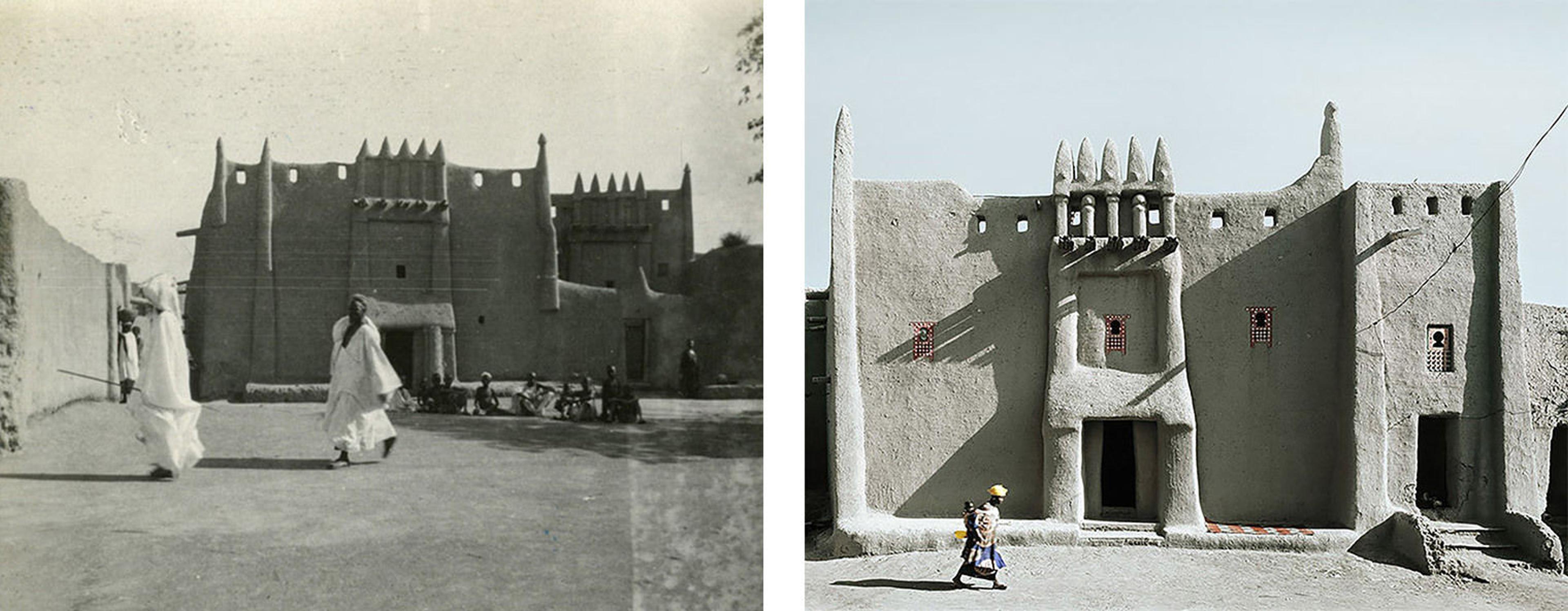 Left: The Great Mosque in Timbuktu, 1904, photographed by Louis Desplagnes (French, 1871–1914), Musée des Confluences, Lyon, inv. 2009.18.1.234. Right: Friday Mosque, Timbuktu, Mali, 1999–2000. Photograph by James Morris