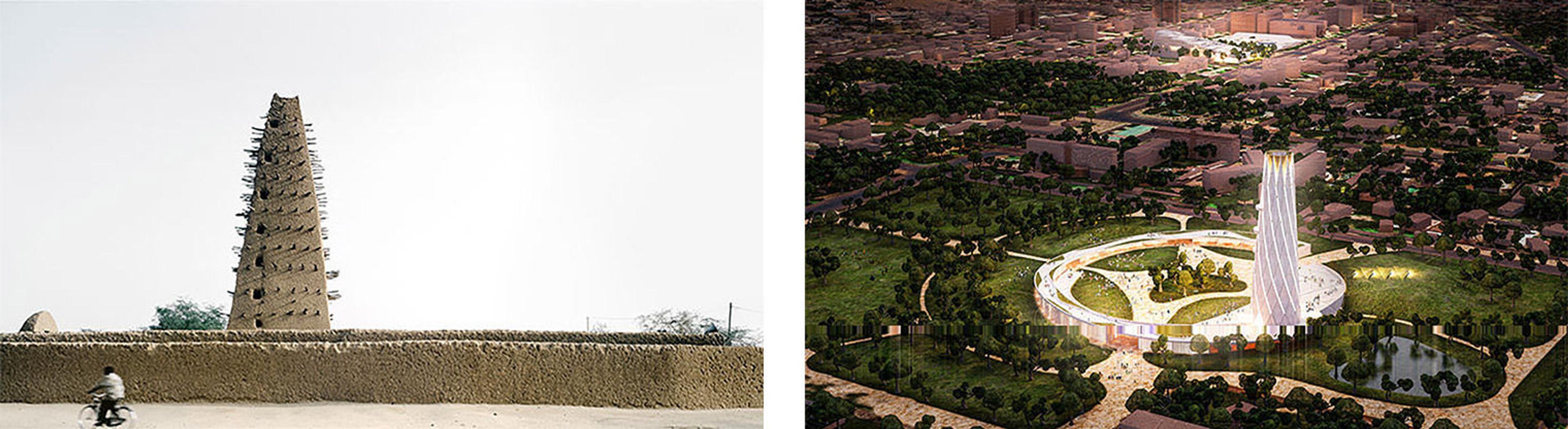 Left: Friday Mosque at Agadez, Niger, 1999–2000. Photograph by James Morris. Right: A render of the Thomas Sankara Memorial in Ouagadougou, Burkina Faso. Image courtesy Kéré Architecture Studio