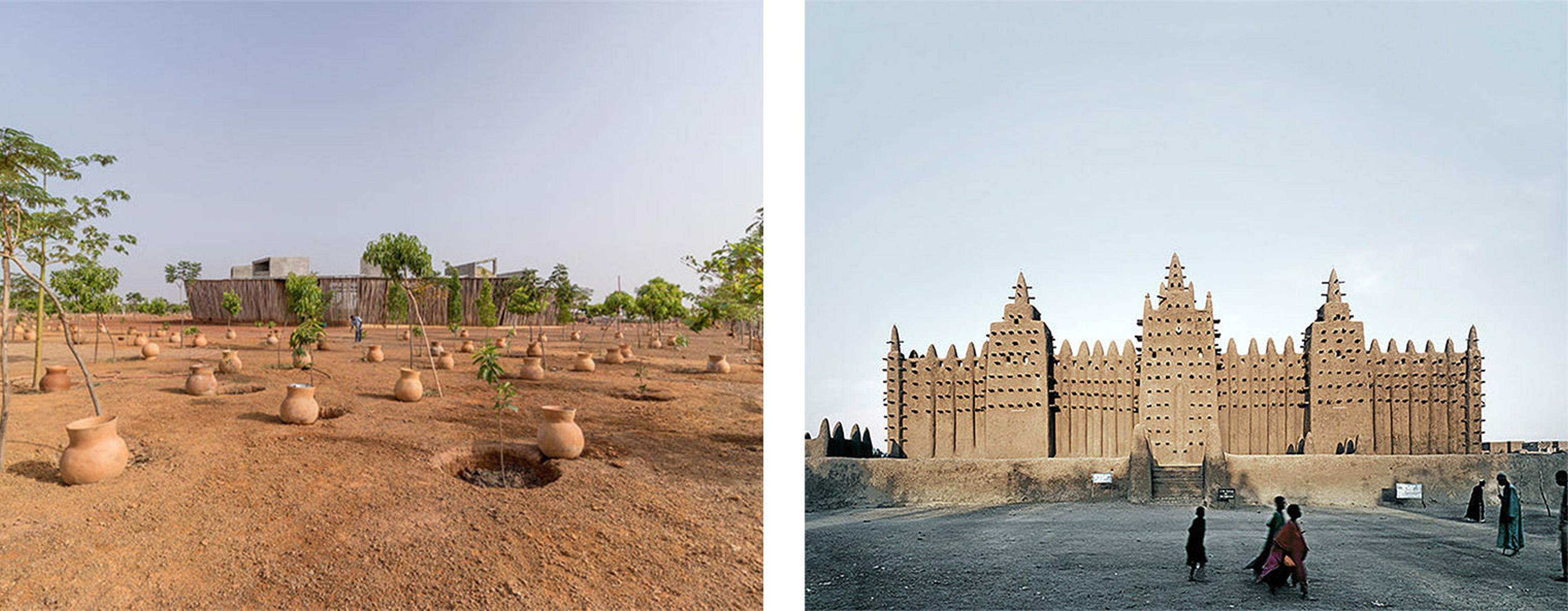 Left: Lycée Schorge, in Koudougou, Burkina Faso. Photograph courtesy Kéré Architecture Studio. Right: Friday Mosque of Jenne, Mali, 1999–2000. Photograph by James Morris