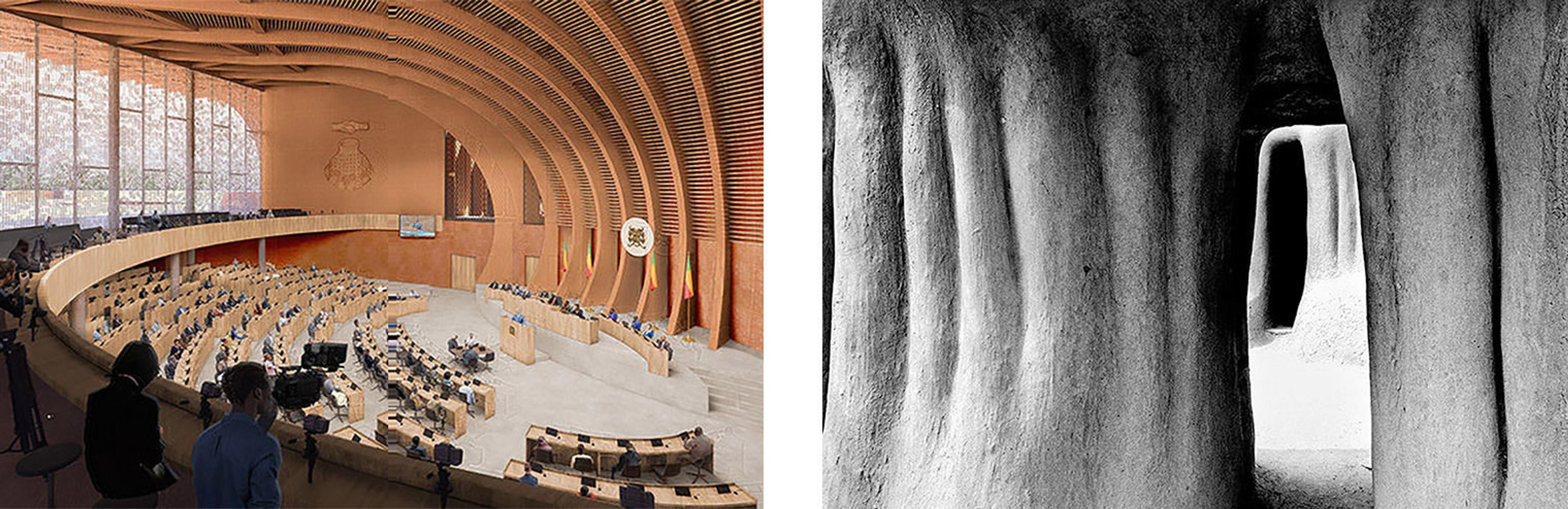 Left: A render of the Benin National Assembly building. Image courtesy Kéré Architecture Studio. Right: Interior of the mosque of Nando, 1999–2000, Mali. Photograph by James Morris