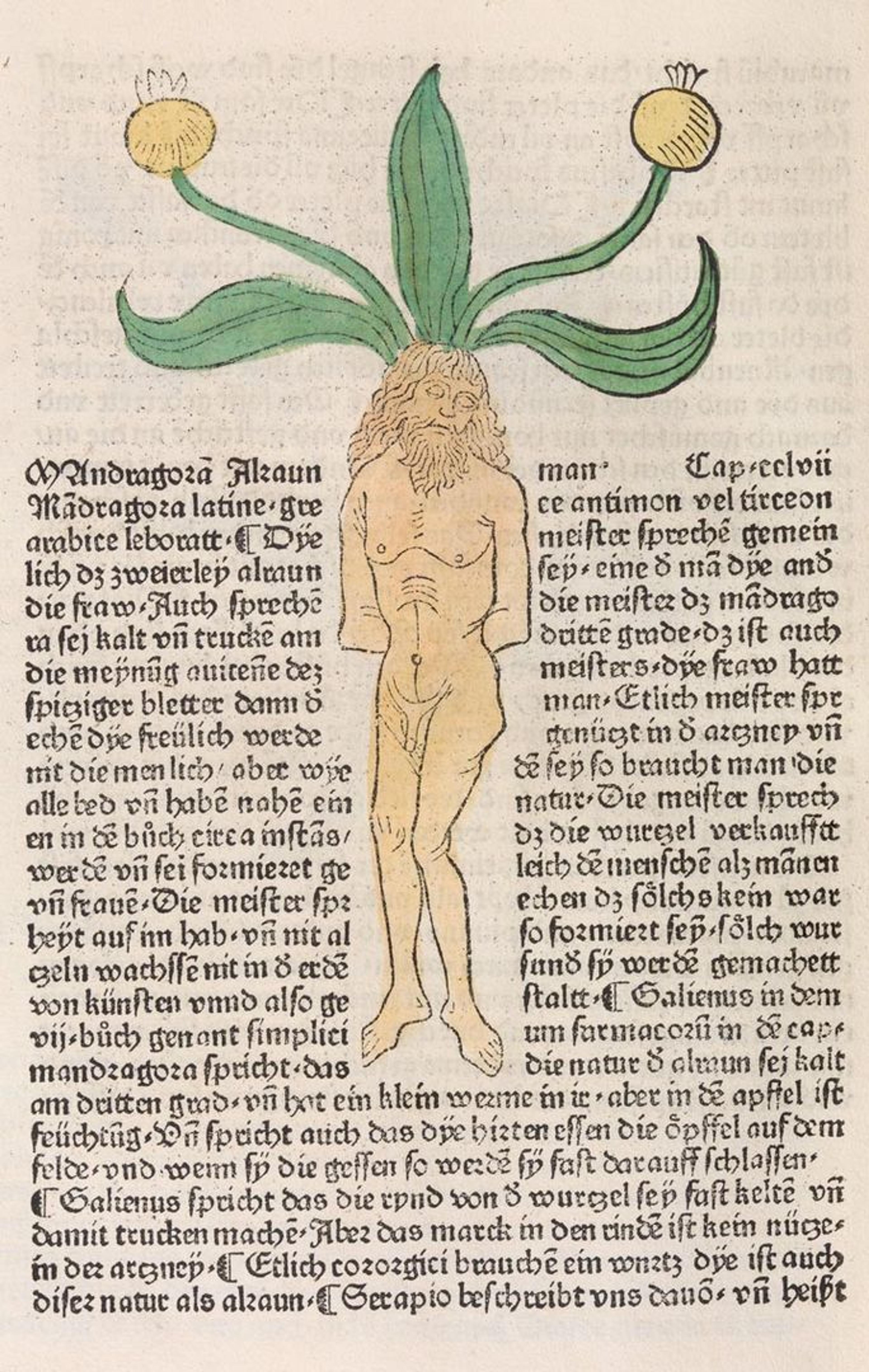 A mandrake from Herbarius - Gart der gesuntheit - Hortus sanitatis. Published by Hans Schönsperger the Elder (German, active 1481–1520). Augsburg, 1485. The Metropolitan Museum of Art, New York, The Elisha Whittelsey Collection, The Elisha Whittelsey Fund, 1944 (44.7.16)