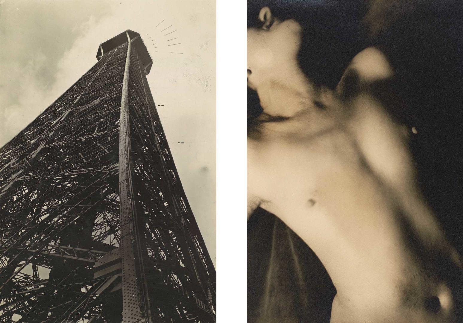 Left: Germaine Krull (French (born Poland), 1897–1985). Tour Eiffel, 1928. Gelatin silver print, 13.6 × 9.0 cm (5 1/4 x 3 5/8 in.). The Metropolitan Museum of Art, New York, Ford Motor Company Collection, Gift of Ford Motor Company and John C. Waddell, 1987 (1987.1100.54). Right: Germaine Krull (French (born Poland), 1897–1985). [Nude], 1928–29. Gelatin silver print, 23.4 x 17.1 cm (9 1/4 x 6 3/4 in.). The Metropolitan Museum of Art, New York, Gilman Collection, Purchase, Anonymous Gift, 2005 (2005.100.559)