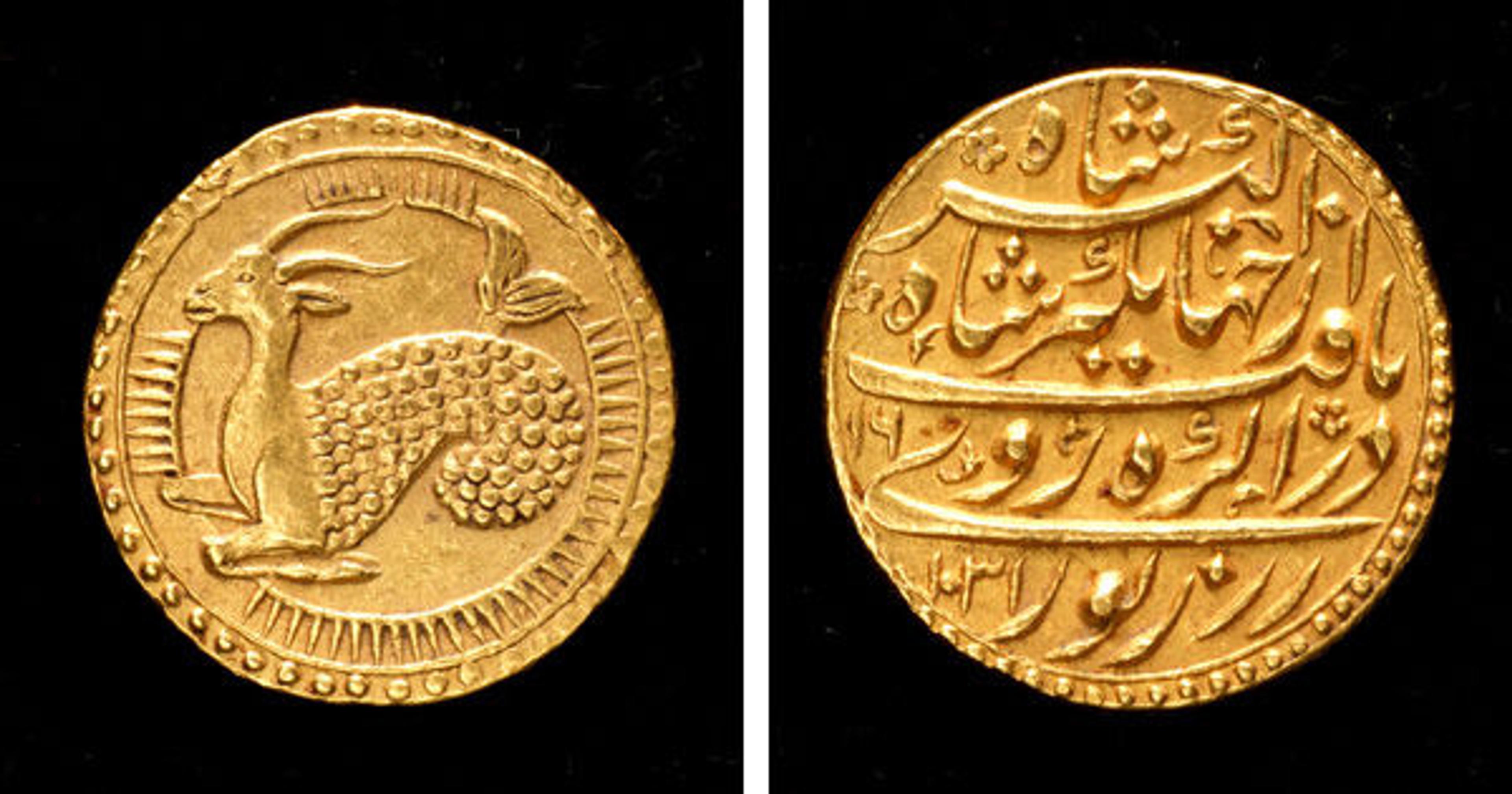 This Mughal coin, minted during the reign of Jahangir (r. 1605–27) in A.H. 1031/A.D. 1621–22, is one of a group of coins representing signs of the zodiac. In his memoirs, Jahangir recounts his decision to have coins minted with these astrological signs:
