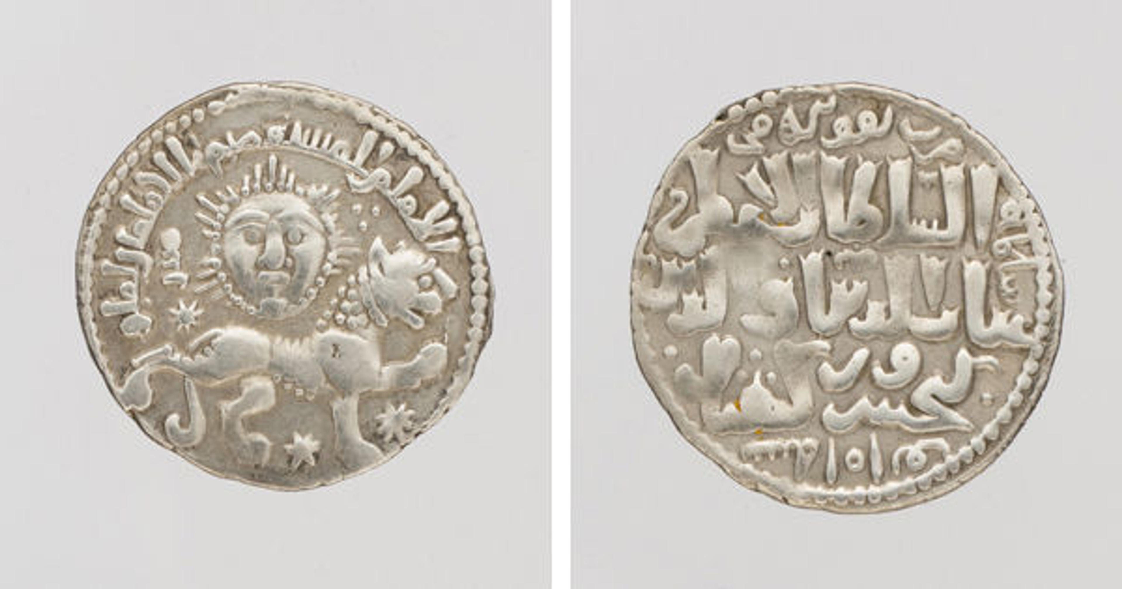 This silver coin was minted in Konya, Turkey, in A.H. 641/A.D. 1243, during the reign of the Rum Seljuq sultan Ghiyath al-Din Kai Khusrau II (r. 1237–46), whose name and title feature prominently on the reverse side of the coin. On the obverse is a central image of a sun face underneath which a striding lion is depicted, as well as the name of the Abbasid caliph to whom the Rum Seljuqs pledged allegiance. A number of interpretations are possible for the imagery on Kai Khusrau II's coin, but I think at a very basic level it is an image of strength. The sultan was particularly fond of the sun-lion motif, and it was minted for several years. It is particularly interesting that in the last years of his reign, the coin design was transformed to a nonfigural one that included the shahada prominently on one side. This change to a more "Islamic" coin indicates the awareness of the sultan that coins carried important messages about the character of the empire.
