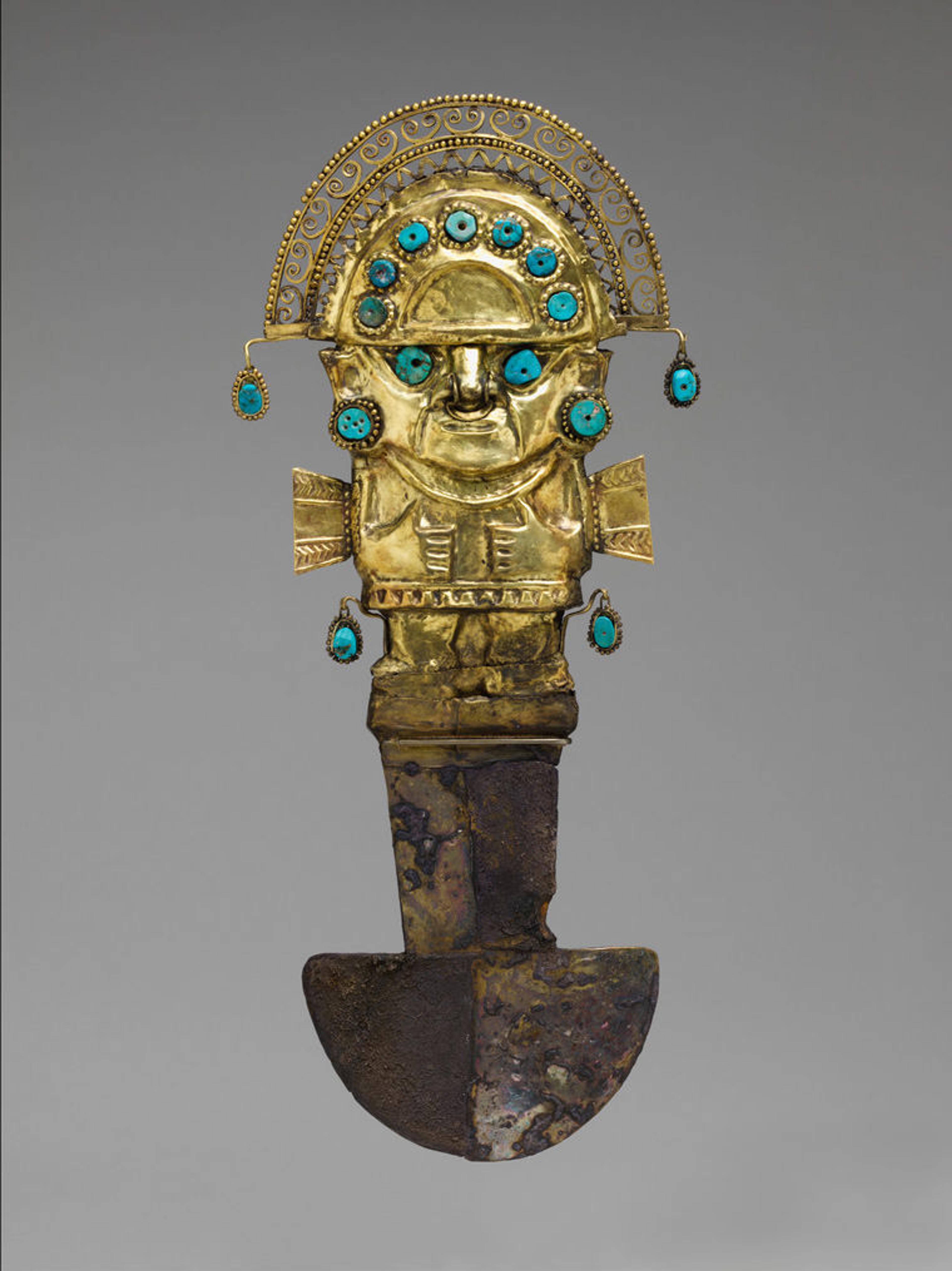 Above: Fig. 1. Ceremonial knife (tumi), A.D. 900–1100. Peru, North Coast. Lambayeque. Gold, silver, turquoise, H: 36.2 cm (14 1/4 in.). The Metropolitan Museum of Art, New York, Gift and Bequest of Alice K. Bache, 1974, 1977 (1974.271.60)