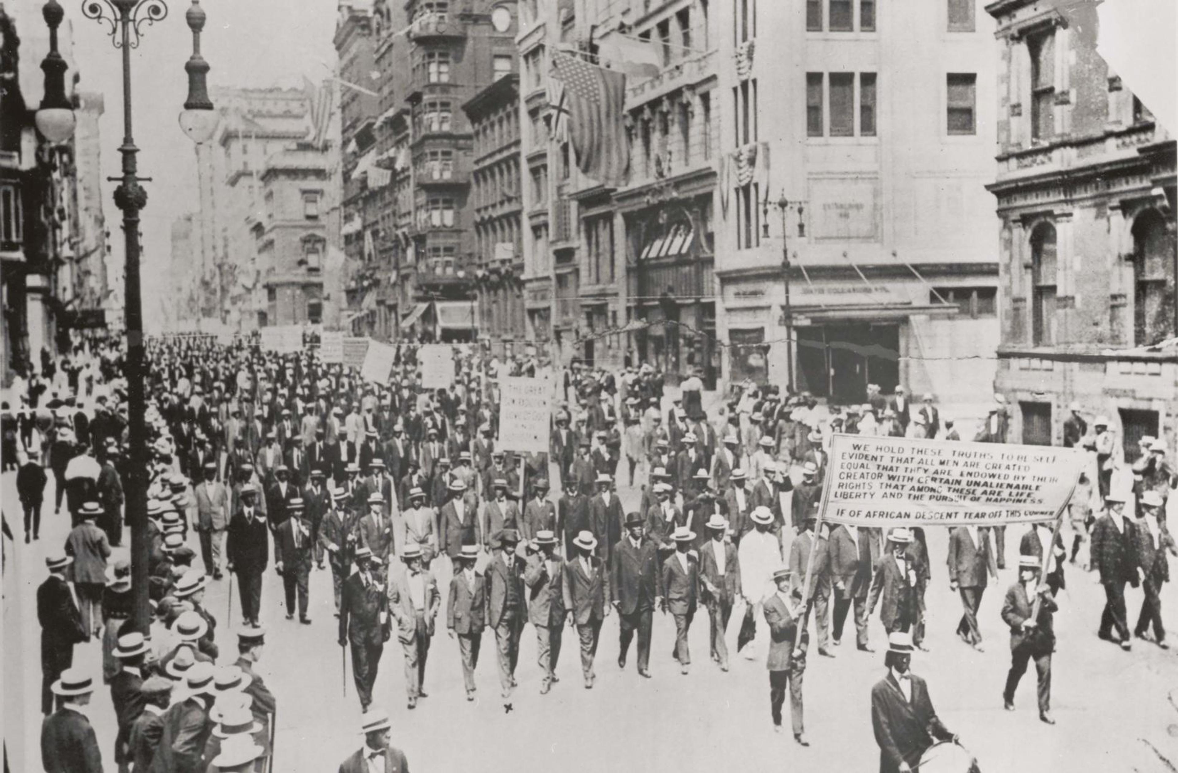 CAMPBELL: The most dramatic, in 1917 was the silent protest where ten thousand African Americans—the women dressed in white, the men dressed in their suits and straw hats, along with children—marched silently down Fifth Avenue to the sound of muffled drums, holding placards with their grievances outlined. And there is some footage of that march that is absolutely extraordinary.