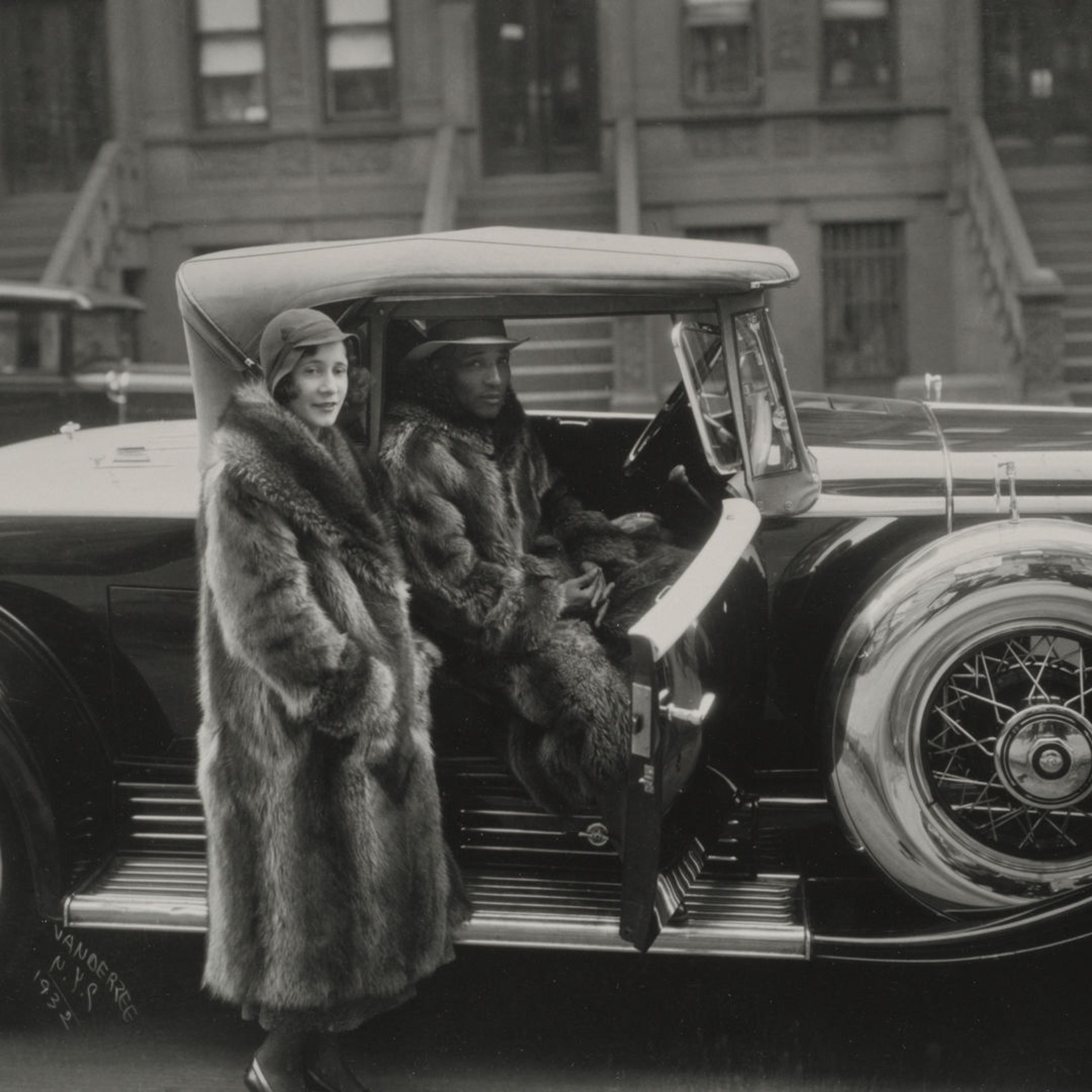 COOKS: Everything about this photograph is impressive. From the background brownstones that we can see in the recess of the photograph to the cars in the photograph, particularly this very fancy Cadillac that takes up most of the picture. And we have this gorgeous couple. The man who’s in the car wearing this full-length raccoon coat, and the woman who’s standing elegantly. I mean, it may have been posed, but it may have just been a really opportunistic photograph of seeing these two people and being so inspired by the way that they look that James Van Der Zee stopped to take their picture.