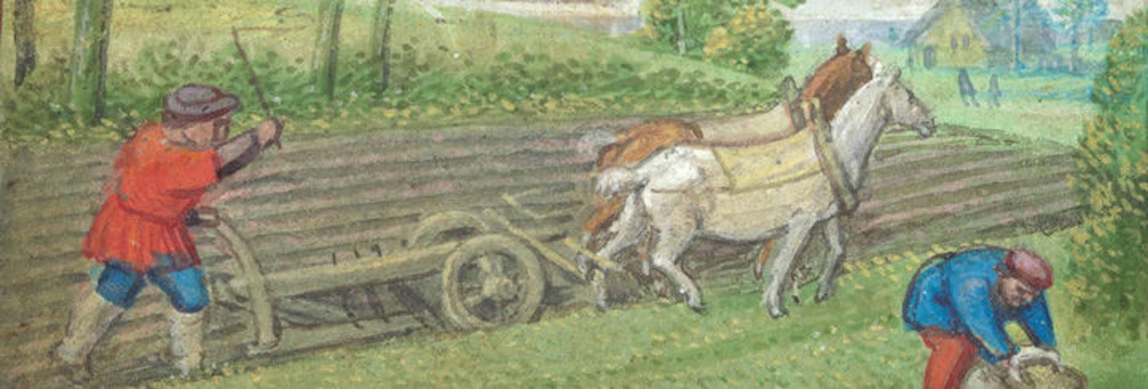 A man with a moldboard plow. Simon Bening (Netherlandish, 1483/84–1561). Book of Hours (detail), ca. 1530–35. Made in Bruges, present-day Belgium. Ink, tempera, and gold on parchment; modern red leather binding; Manuscript: 2 9/16 x 2 1/16 x 1 1/8 in. (6.5 x 5.2 x 2.9 cm) Folio: 2 5/16 x 1 5/8 in. (5.9 x 4.2 cm) Illumination only: 1 7/8 x 1 5/16 in. (4.8 x 3.4 cm) Text area: 1 7/16 in. x 1 in. (3.6 x 2.6 cm). The Metropolitan Museum of Art, New York, The Cloisters Collection, 2015 (2015.706)