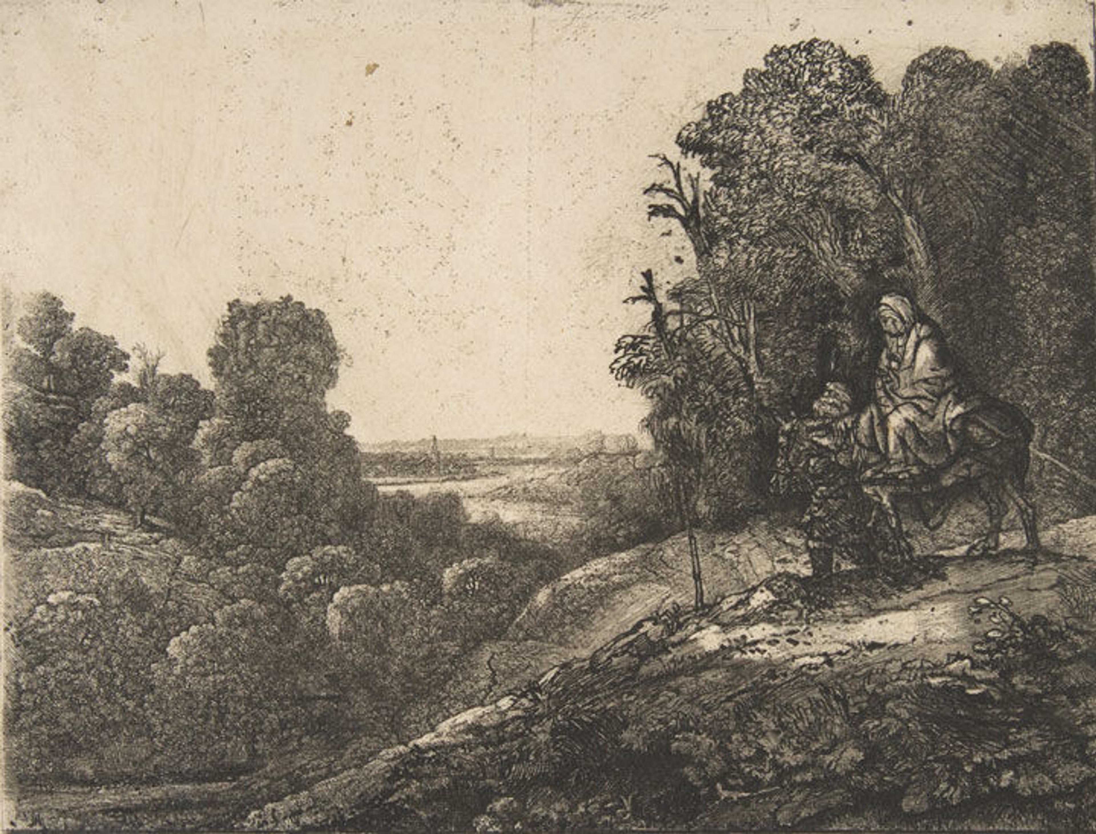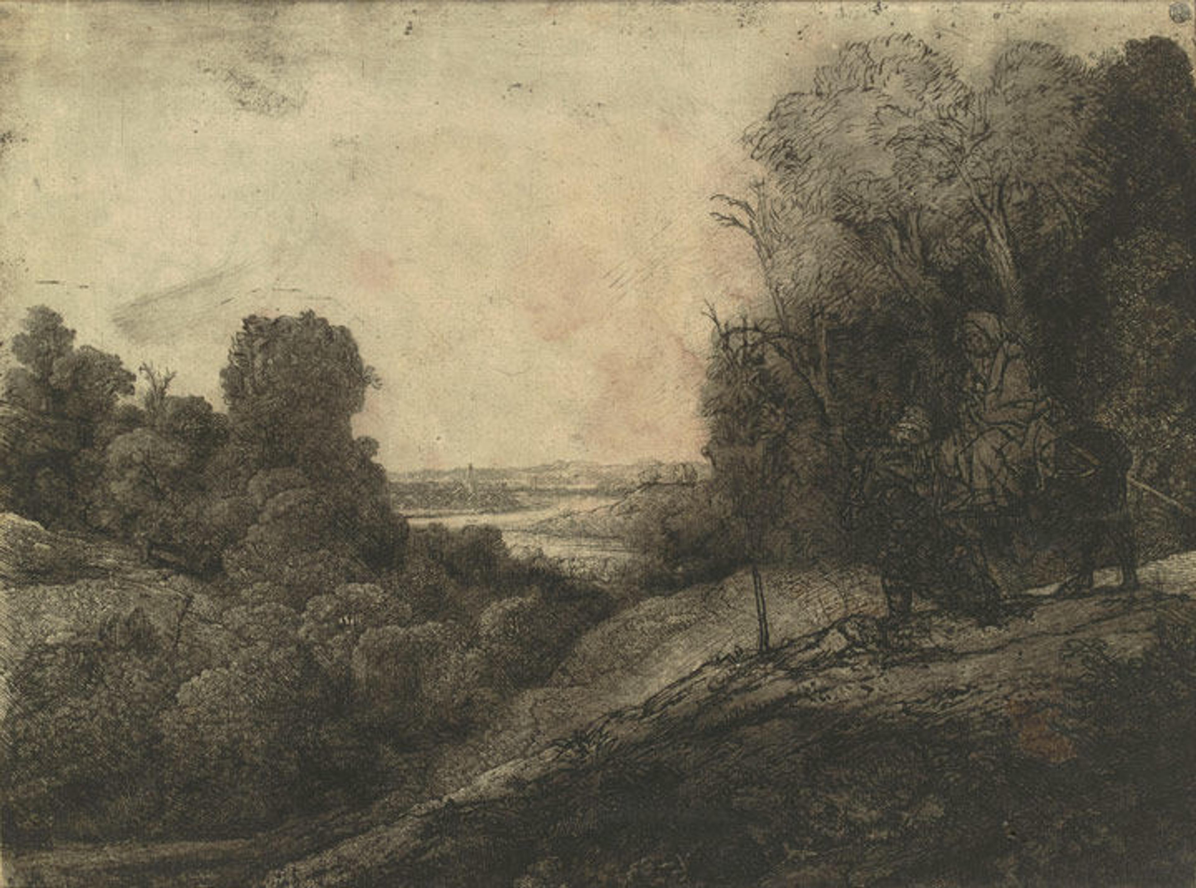 Rembrandt van Rijn (Dutch, 1606–1669). The Flight into Egypt, altered from Tobias and the Angel by Hercules Segers, ca. 1653. Etching reworked with drypoint and burin by Rembrandt; sixth state of seven, Plate: 8 7/16 x 11 in. (21.4 x 28 cm); Sheet: 9 1/16 x 11 1/2 in. (23 x 29.2 cm). The Metropolitan Museum of Art, New York, Rogers Fund, 1919 (19.19.4)
