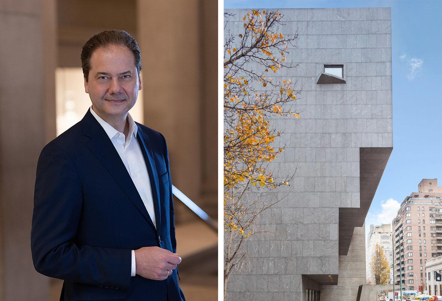 Left: Max Hollein, Marina Kellen French Director of The Metropolitan Museum of Art. Right: A view of the Breuer building, formerly The Met Breuer now Frick Madison