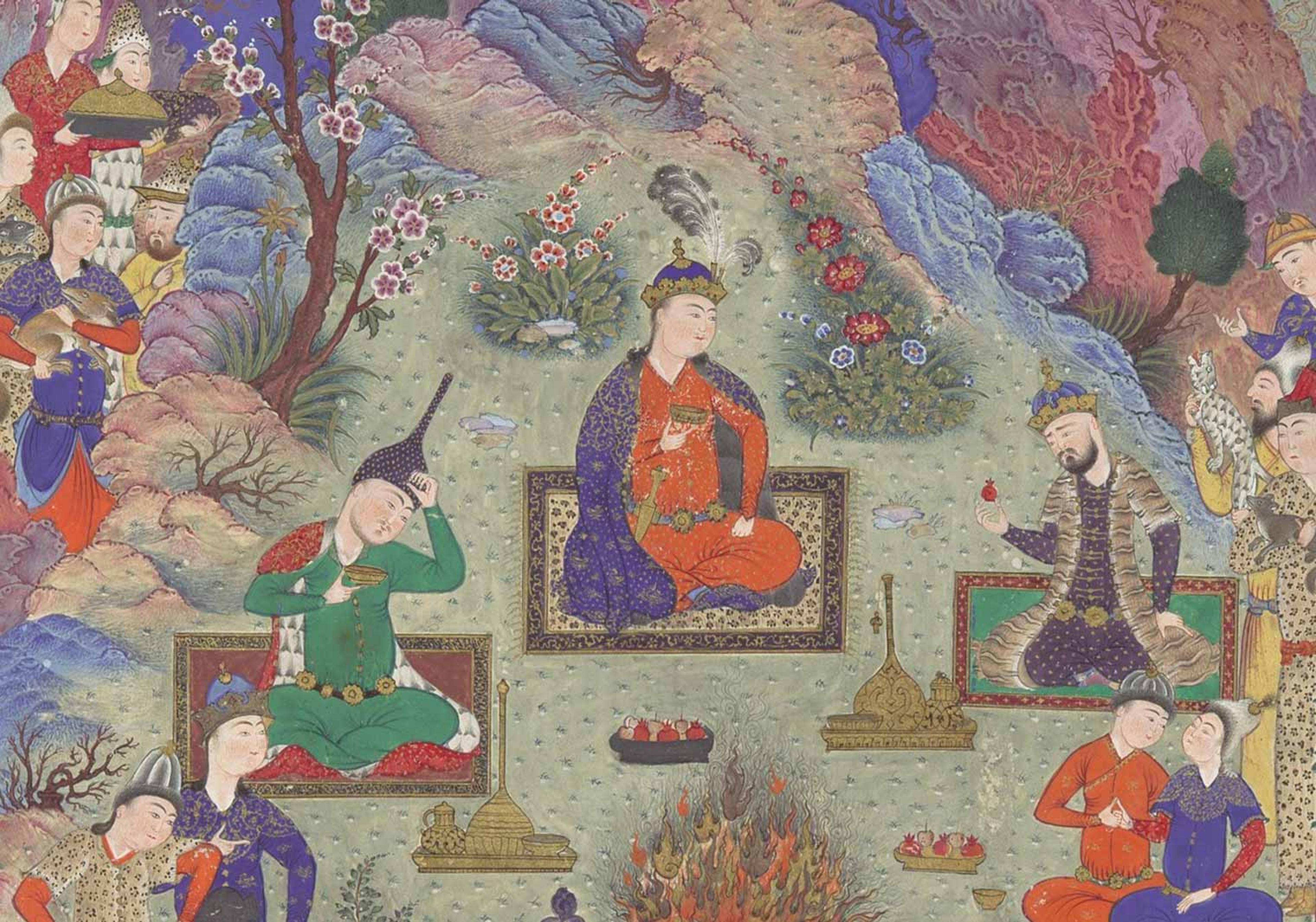 Abu'l Qasim Firdausi (Iranian, ca. 940/41–1020), Painting attributed to Bashdan Qara (Iranian, active ca. 1525–1535). “The Feast of Sada”, Folio 22v from the Shahnama (Book of Kings) of Shah Tahmasp (detail), ca. 1525–30. Opaque watercolor, ink, silver, and gold on paper, H. 18 1/2 in. (47 cm), W.12 1/2 in. (31.8 cm). The Metropolitan Museum of Art, New York, Gift of Arthur A. Houghton Jr., 1970 (1970.301.2)
