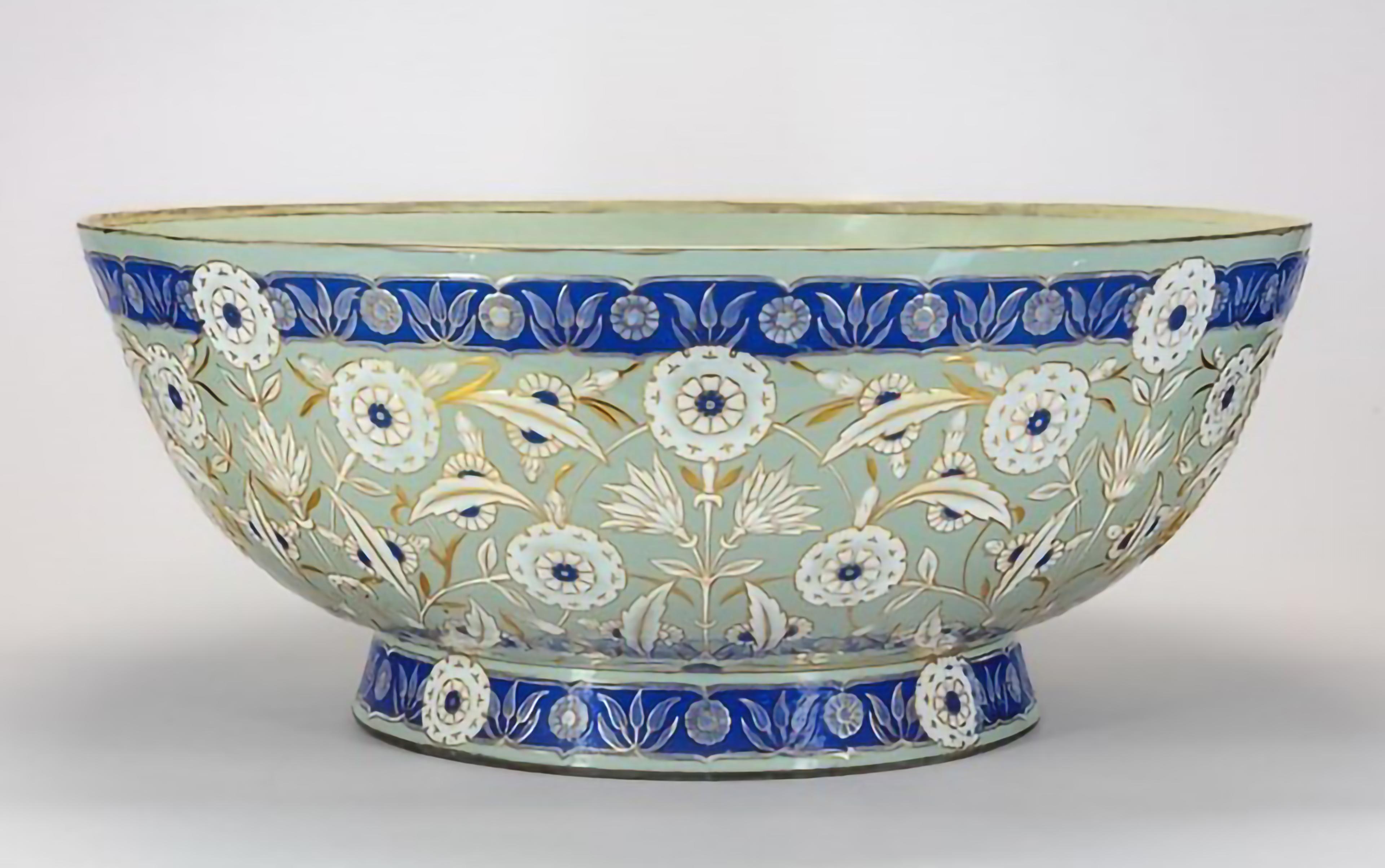 Sèvres Manufactory (French, 1740–present). Large ceramic bowl, 1850. Hard-paste porcelain; pâte-sur-pâte, polychrome glaze, and gold, 13 x 32 3/8 in. (33 x 82 cm). The Metropolitan Museum of Art, New York, Purchase, Alexandra Wait, William Wait, and Younghee Kim-Wait Gift and Turkish Centennial Fund, 2024 (2024.409)