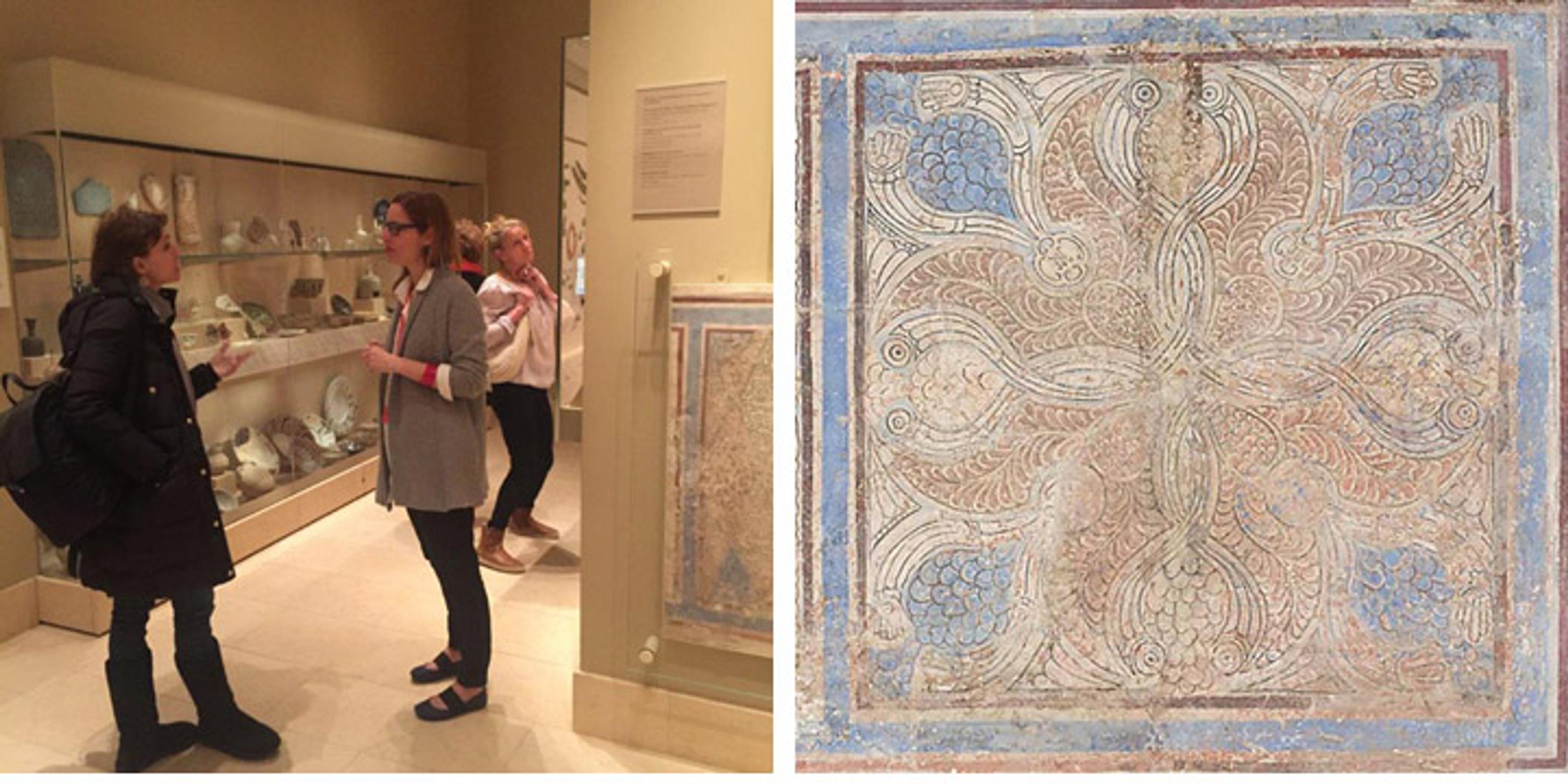 Left: In gallery 452, Assistant Curator Martina Rugiadi converses with a visitor about the artworks from Iran and Central Asia. Photo by Kim Benzel. Right: Painted dado panels, ca. 9th century. Excavated in Iran, Nishapur. Painted stucco, H. 40 3/8 in. (102.6 cm), W. 53 1/2 in. (135.9 cm), D. 2 in. (5.1 cm), Wt. 195 lbs (88.5 kg). The Metropolitan Museum of Art, New York, Rogers Fund, 1940 (40.170.176)