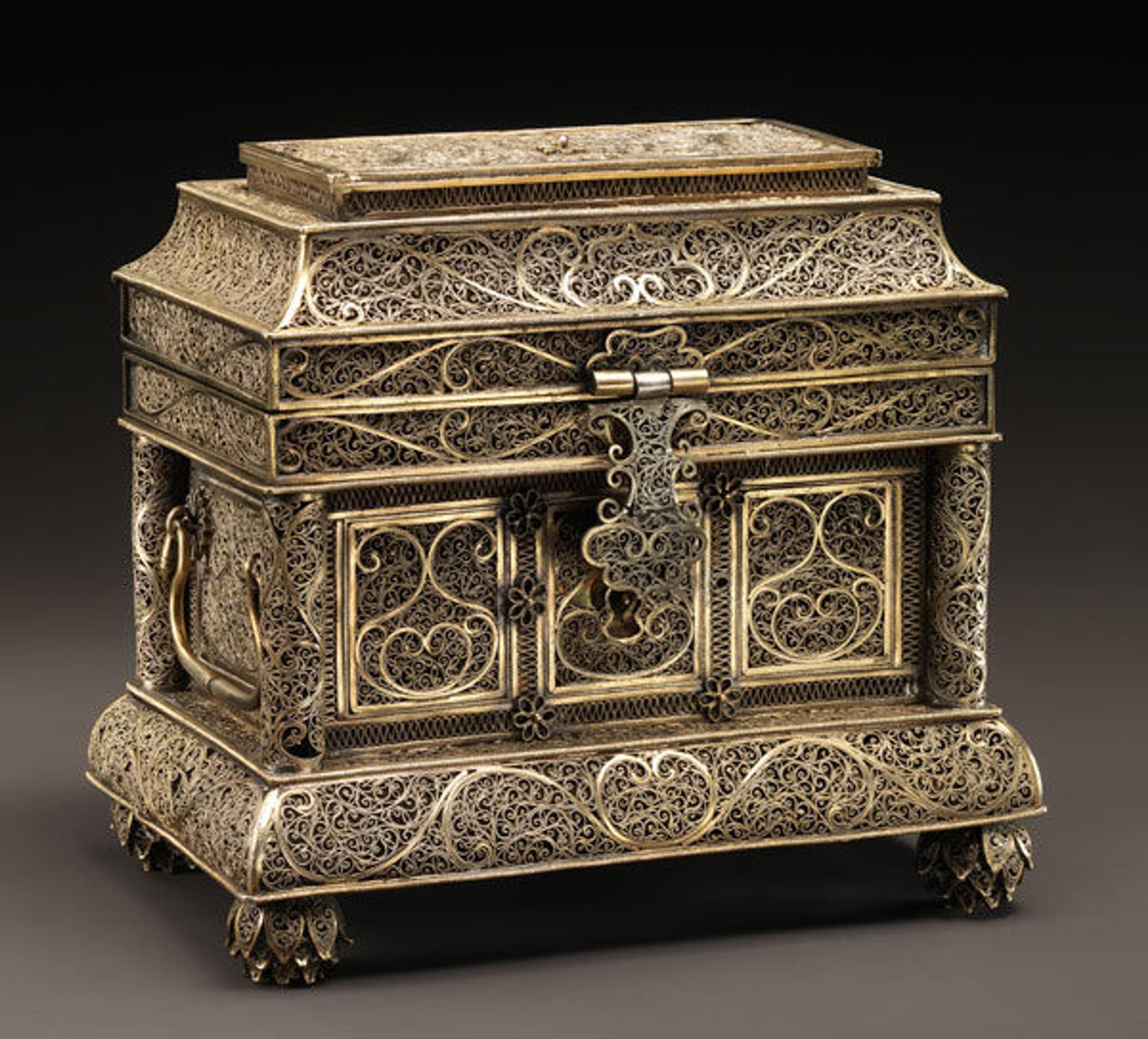 This seventeenth-century box from Goa, in India, incorporates a filigree technique that was popular in Portugal at the time. Goanese filigree box, 17th century. India. Silver filigree, parcel-gilt; 5 1/8 x 5 1/8 x 3 3/4 in (13 x 13 x 9 cm). The Metropolitan Museum of Art, New York, Purchase, Friends of Islamic Art Gifts, Elizabeth S. Ettinghausen Gift, in memory of Richard Ettinghausen, and Ralph D. Minasian, and The Irene Diamond Fund Inc. Gifts, 2014 (2014.253).