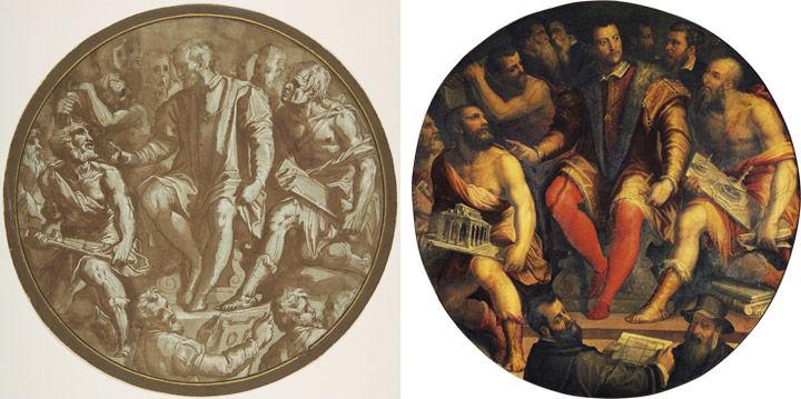 Left: Fig. 1. Attributed to Jacopo Zucchi (Italian, ca. 1540–1596). Grand Duke Cosimo I of Tuscany Surrounded by His Artists, ca. 1556–62. Pen and brown ink, brush and brown wash, highlighted with white gouache, over traces of black chalk or graphite, on gray-green paper, diameter: 9 3/16 in. (23.4 cm). The Metropolitan Museum of Art, New York, Rogers Fund, 1958 (58.104). Right: Fig. 2. Giorgio Vasari (Italian, 1511–1574). Grand Duke Cosimo I of Tuscany Surrounded by His Artists, ca. 1556–62. Oil on wood panel. Salone dei Cinquecento, Palazzo Vecchio, Florence