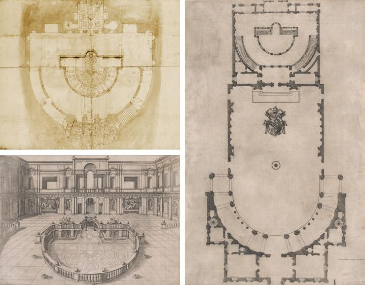 Top left: Fig. 18. Anonymous, French, 16th century. Villa Giulia, Plan, ca. 1550–80. Pen and dark brown ink, brush and brown wash, over traces of black chalk, ruling and compass work, on a gathering of five sheets of paper, 23 1/4 x 16 1/4 in. (59 x 41.3 cm). The Metropolitan Museum of Art, New York, Gift of Janos Scholz and Anne Bigelow Scholz, in memory of Flying Officer Walter Bigelow Rosen, RCAF, 1949 (49.92.73). Bottom left: Fig. 19. Anonymous. Plan of (Part of) the Villa Giulia, with the Arms of Pope Julius III Engraved at the Center, from the Speculum Romanae Magnificentiae, ca. 1550–80. Engraving, sheet: 18 7/8 x 13 3/8 in. (48 x 33.9 cm). The Metropolitan Museum of Art, New York, Rogers Fund, Transferred from the Library, 1941 (41.72[3.37]). Right: Fig. 20. Anonymous. View of the Courtyard within the Villa Giulia in Rome, from the Speculum Romanae Magnificentiae, ca. 1550–80. Engraving, sheet: 13 5/8 x 18 1/8 in. (34.6 x 46 cm). The Metropolitan Museum of Art, New York, Rogers Fund, Transferred from the Library, 1941 (41.72[3.52]).