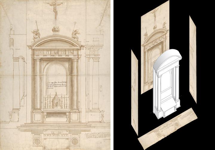 Reading all the information that is given in this type of drawing requires a trained architectural eye. For the purpose of our display at The Met, we were assisted by Leonardo Pili, who created digitally enhanced reconstructions to visualize the projects in three dimensions. In the case of Vincenzo de' Rossi's design for an altar, the reconstruction beautifully underlined the meticulous execution of the orthogonal scheme. The implicit three-dimensionality allows it to be folded into a box-like structure to functions as a miniature model of the altar (fig. 7).