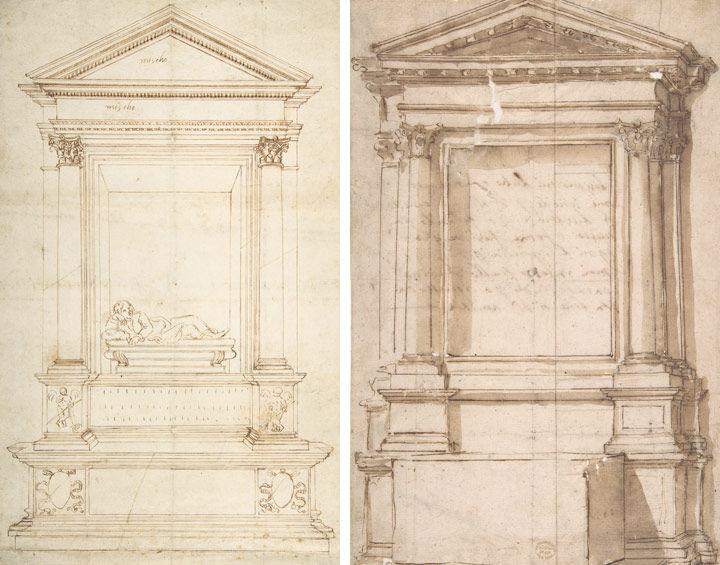 Left: Fig. 8. Anonymous, Central Italian, 16th century. Design for a Wall Tomb, ca. 1524. Pen and brown ink, over stylus-ruled and compass-incised construction marks, on light tan laid paper, 14 3/8 x 9 1/16 in. (36.5 x 23 cm). The Metropolitan Museum of Art, New York, Edward Pearce Casey Fund, 1998 (1998.254). Right: Fig. 9. Anonymous, Central Italian, 16th century. Architectural Frame for Altar, ca. 1550–80. Pen and brown ink, washed, 12 1/2 x 8 in. (31.8 x 20.3 cm). The Metropolitan Museum of Art, New York, Gift of Cornelius Vanderbilt, 1880 (80.3.593)