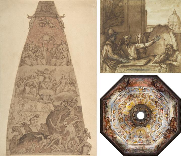 Left: Fig. 3. Federico Zuccaro (Zuccari) (Italian, 1540/42–1609). Scene from The Last Judgment, Study for the Fresco Decoration of One of the Segments of the Cupola of the Cathedral of Santa Maria del Fiore in Florence, 1576–79. Pen and brown ink, brush and brown wash, over red chalk on ecru paper, 17 5/8 x 9 13/16 in. (44.8 x 24.9 cm). The Metropolitan Museum of Art, New York, Rogers Fund, 1961 (61.53). Top right: Fig. 4. Federico Zuccaro (Zuccari) (Italian, 1540/42–1609). Federico Zuccaro Showing the Bozzetto for the Cupola to the Board of Overseers with Giorgio Vasari and Vincenzio Borghini, after 1575. Pen and ink with brown wash. Gallerie degli Uffizi, Gabinetto Disegni e Stampe, Florence. Bottom right: Fig. 5. Interior view of the Dome of the Cathedral of Santa Maria del Fiore, Florence. © Leonardo Pili, 2017