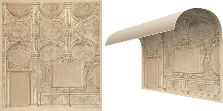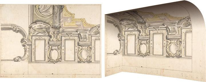 Left: Fig. 12. Anonymous, Italian, 18th century. Design for a Wall and Ceiling with Frames and Decorations in Stucco, ca. 1690–1710. Black chalk, pen and brown ink, brown wash, sheet: 15 9/16 x 14 7/16 in. (39.5 x 36.7 cm). The Metropolitan Museum of Art, New York, Purchase, Brooke Russell Astor Bequest, 2013 (2013.210). Right: Fig. 13. Reconstruction of the architectural space. © Leonardo Pili, 2017