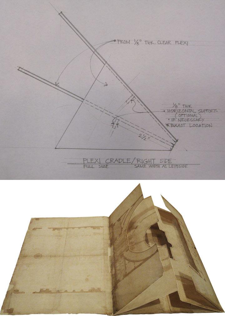Top: Fig. 21. Working drawing for the production of a custom Plexiglas stand for the Villa Giulia drawing. © Ricky Luna, 2017. Bottom: Fig. 22. Reconstruction of the layers of the drawing "opened up" by the Plexiglass stand. © Leonardo Pili, 2017