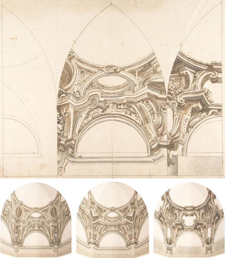 Top: Fig. 16. Anonymous, Italian, Piedmontese, 18th century. Three Designs for the Decoration of a Vault or Dome, 1700–1730, Pen and brown ink, brush with gray and brown wash, over lead point or graphite, with ruled and compass construction, 14 5/16 x 20 3/16 in. (36.4 x 51.2 cm). The Metropolitan Museum of Art, New York, Gift of Leon Dalva Sr., 1965 (65.654.14). Bottom: Figs. 17a–c. Reconstructions of the three different options for the decoration scheme. © Leonardo Pili, 2017