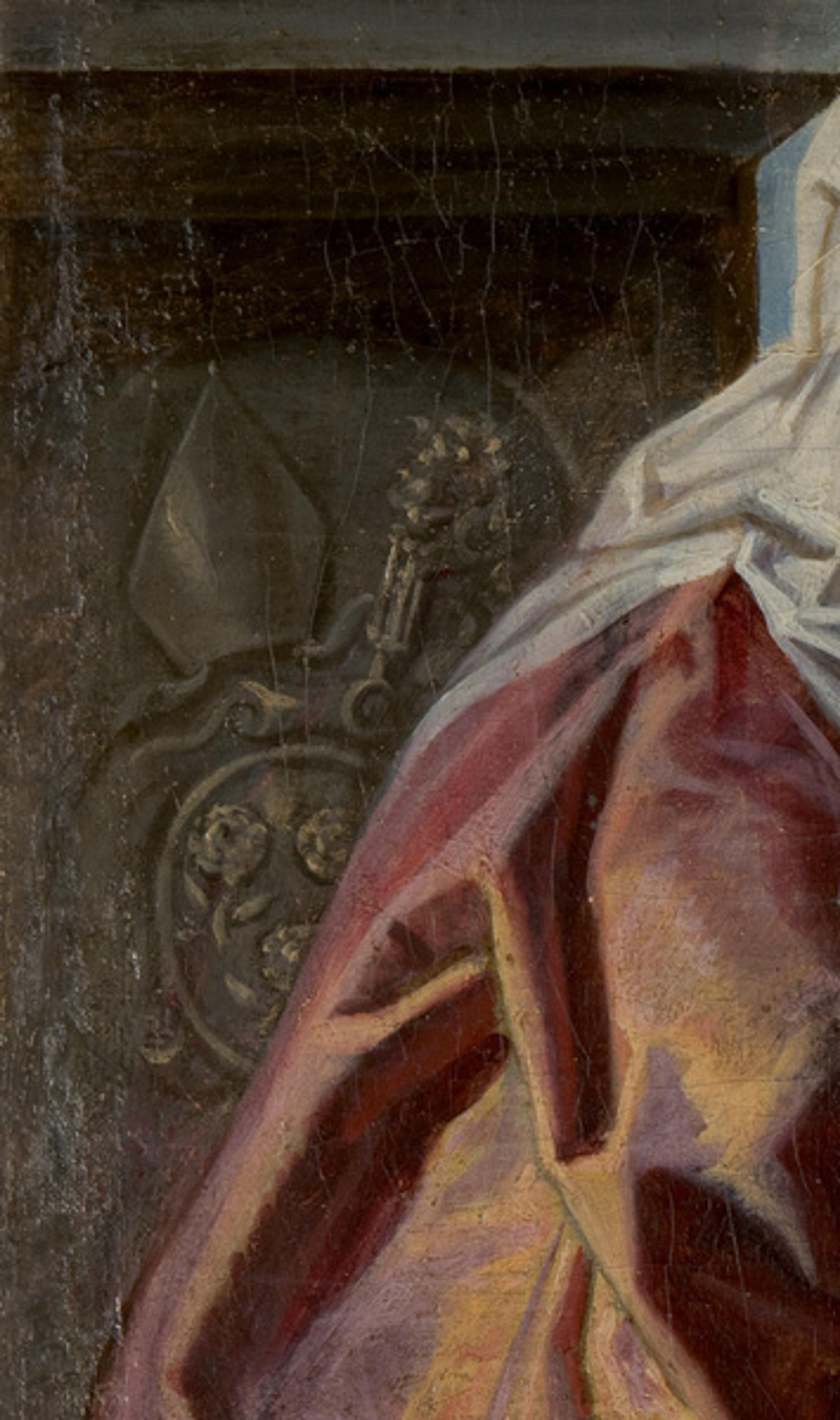 One of the most exciting discoveries was an overpainted coat of arms on the base of the column to the far left of the painting. We were able to identify this as the coat of arms of Antonius de Roore, a Benedictine abbot who was almost certainly the patron of Jordaens's first independent altarpiece.