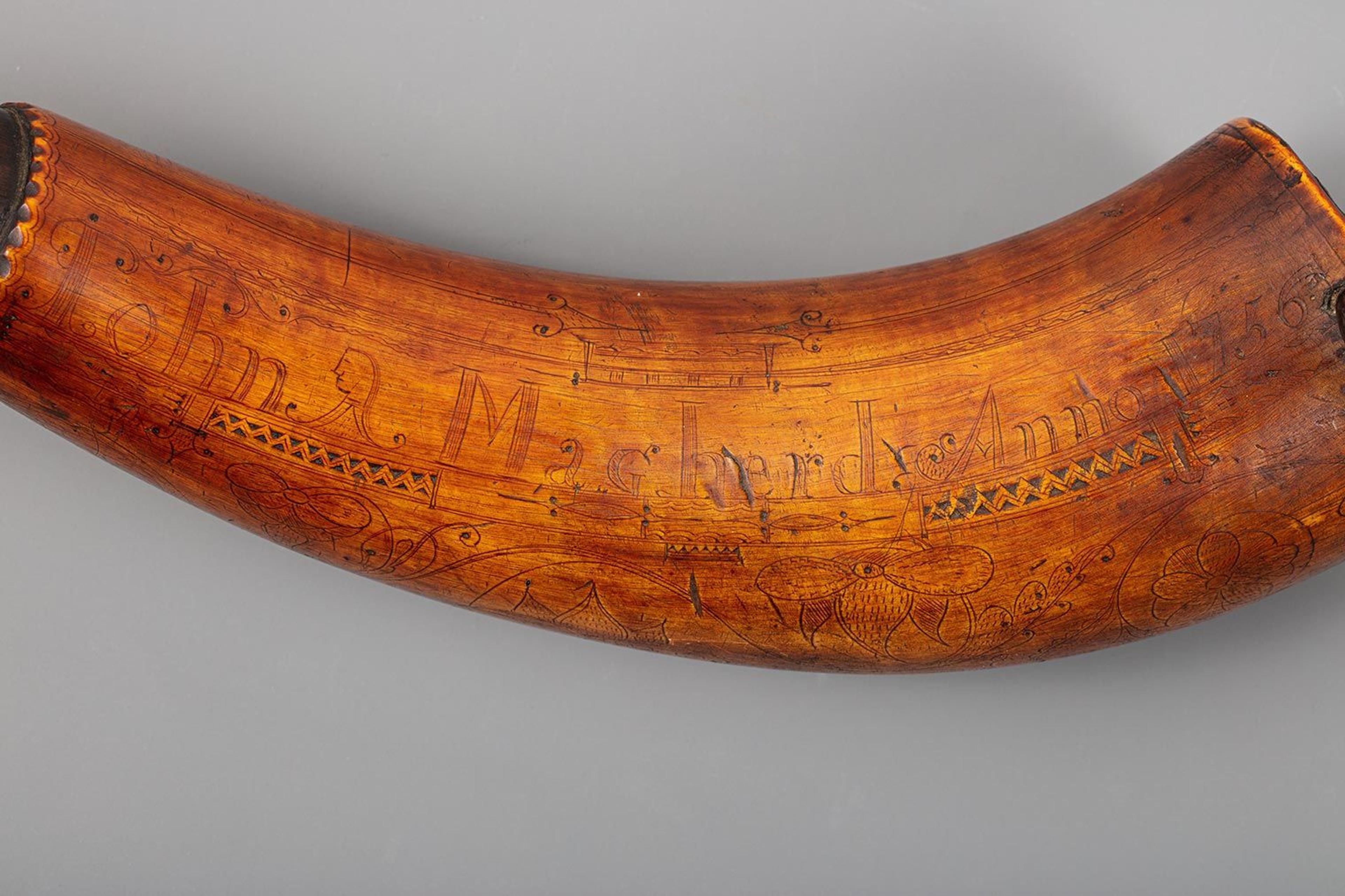 Engraved by John Bush (American, ca. 1725–ca. 1758). Powder horn of William Williams, ca. 1756. Colonial American. Cowhorn, wood, iron. Historic Deerfield, Deerfield, Massachusetts, The William H. Guthman Collection of American Engraved Powder Horns (inv. HD 2005.20.6). Photograph courtesy of Historic Deerfield
