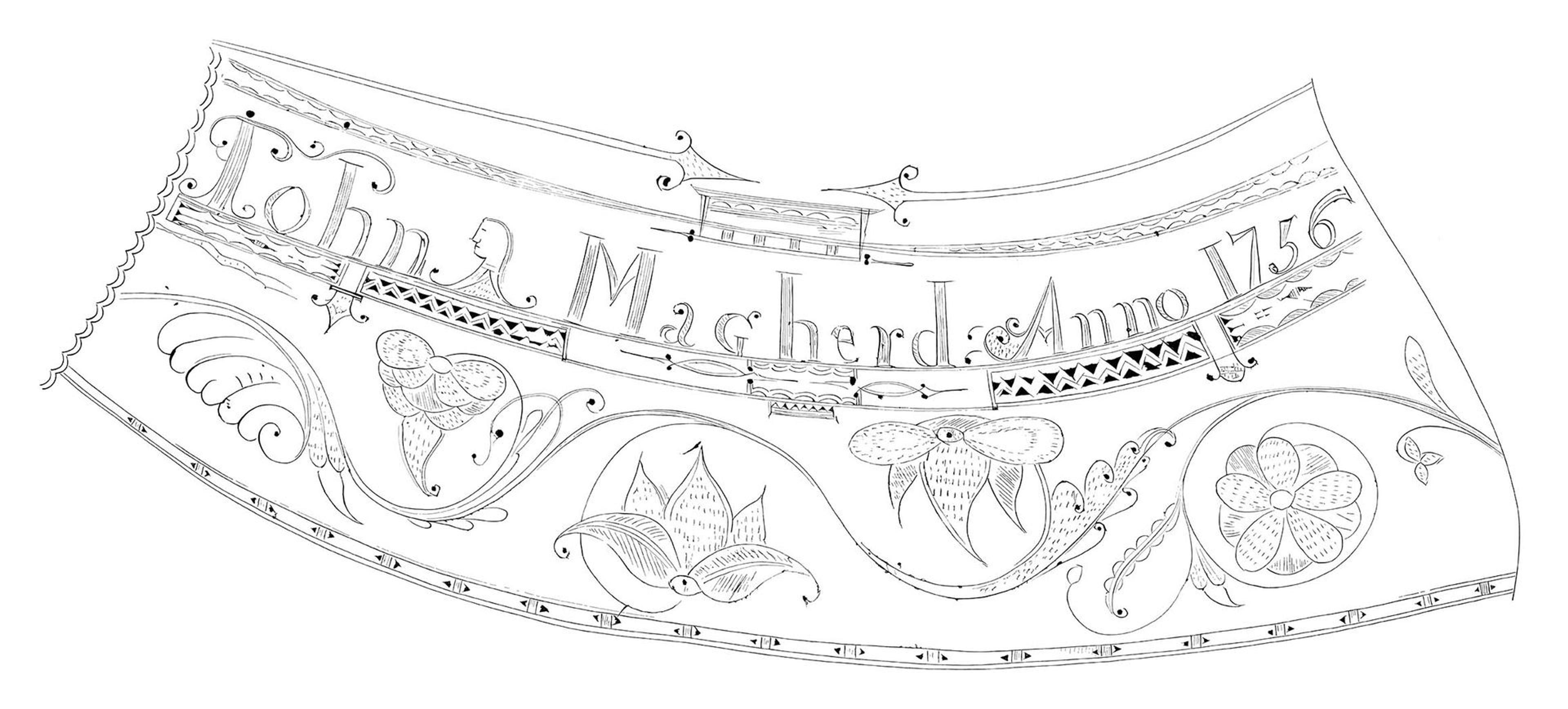 Several details of the powder horn of John Mahard distinguish Bush’s hand. Top left: a copperplate calligraphy with tendrils sprouting from capital letters and a lambda-shaped chest. Top right: dashes and hatching fill the spaces between letters and tendrils; slightly arched serifs decorate at the bases of the letters, including the distinctive form of the capital A. Middle: a row of double arrowheads. Bottom: bands of addorsed triangular designs and zigzags, floral scrollwork, and shell-like scrolls. Punched-carved dots and triangular designs are visible throughout.