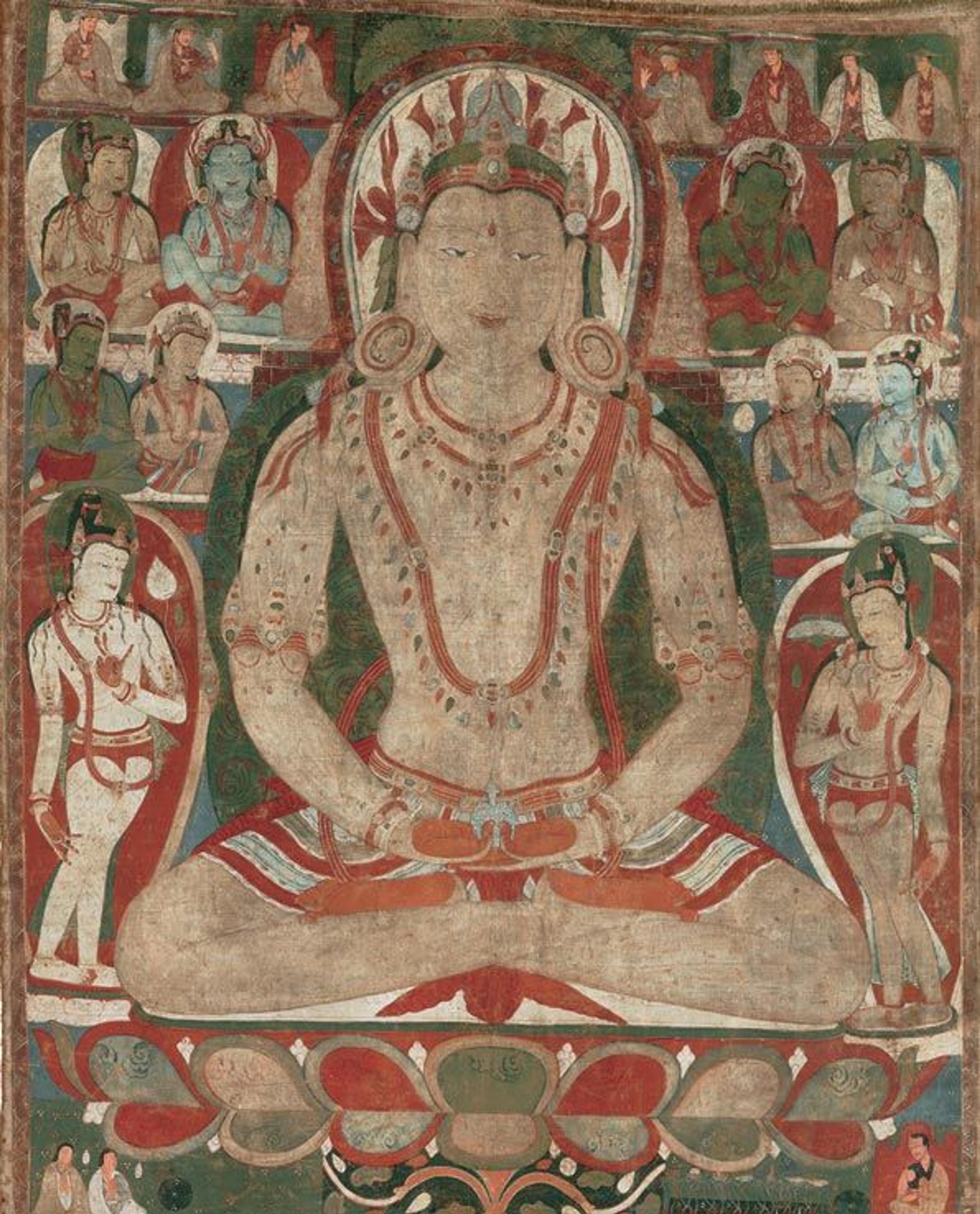 The Buddha Amitayus Attended by Bodhisattvas. Tibet, 11th or early 12th century. Mineral and organic pigments on cloth; Overall: 54 1/2 x 41 3/4 in. (138.4 x 106.1 cm). The Metropolitan Museum of Art, New York, Rogers Fund, 1989 (1989.284)
