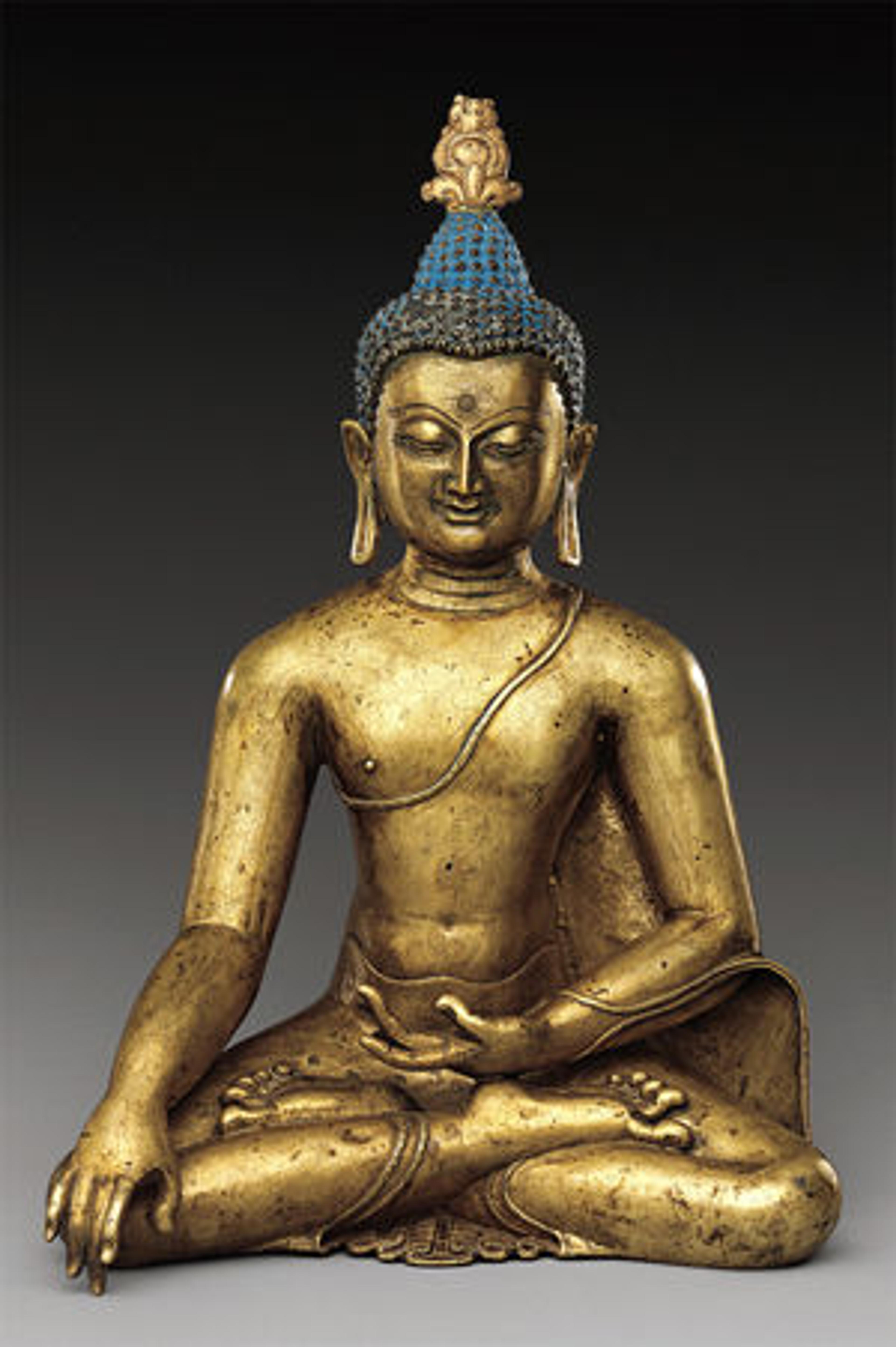 Left: Seated Buddha Reaching Enlightenment. Central Tibet, 11th–12th century. Brass with color pigments; H. 15 1/2 in. (39.4 cm); W. 10 7/16 in. (26.5 cm); D. 8 5/8 in. (21.9 cm). The Metropolitan Museum of Art, New York, Purchase, Lila Acheson Wallace, Oscar L. Tang, Anthony W. and Lulu C. Wang and Annette de la Renta Gifts, 2012 (2012.458)