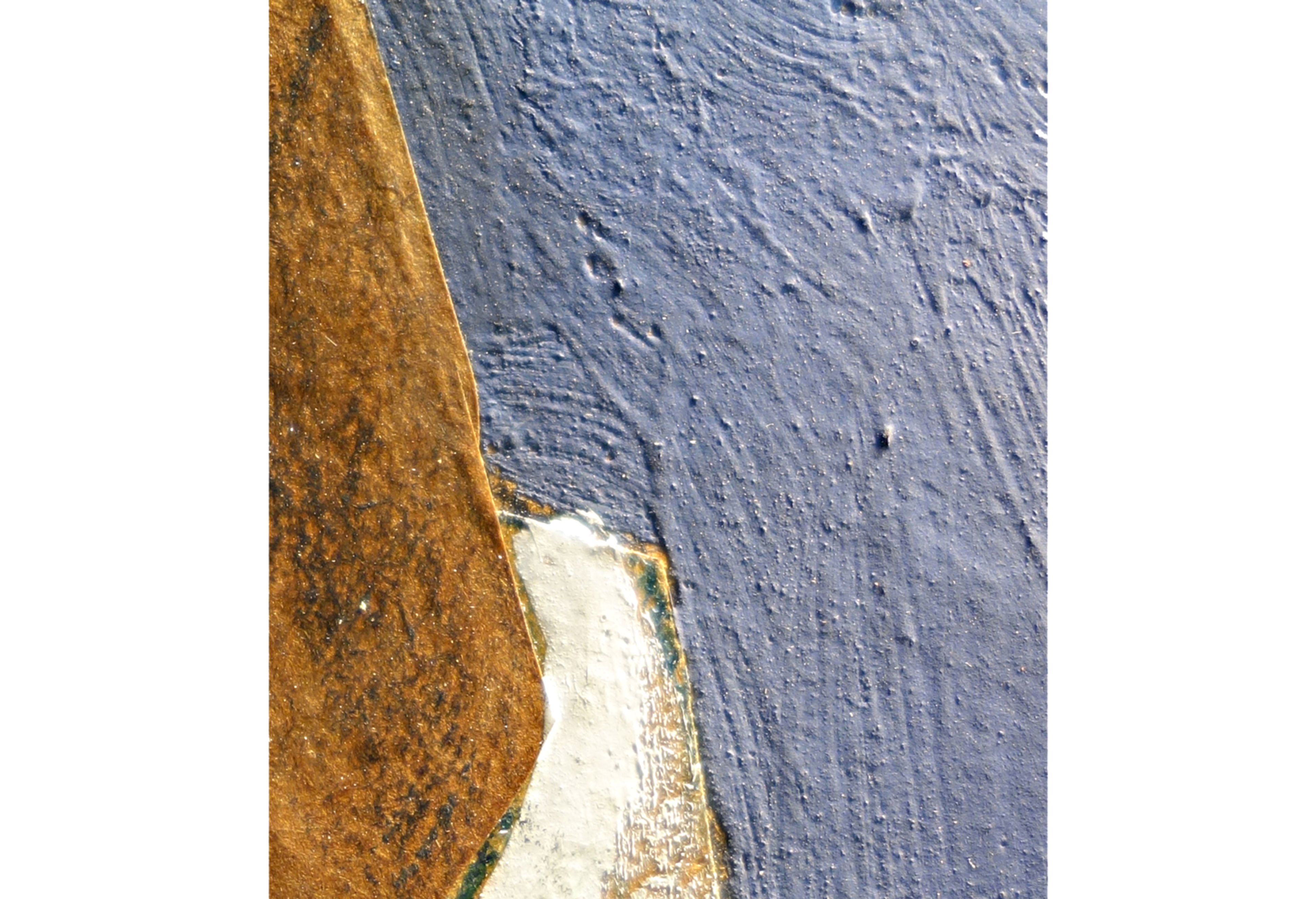 The background of Cup, Glasses, and Bottle (Le Journal) is painted with a gouache that Gris would have purchased in tube form from an art supply store. This opaque watercolor, primarily composed of gum and pigment, was applied in thick layers that trapped small air bubbles within as it dried to a dense, matte surface (FIG. 1). The paint Gris used in Flowers, on the other hand, has a different appearance when magnified and is likely oil.