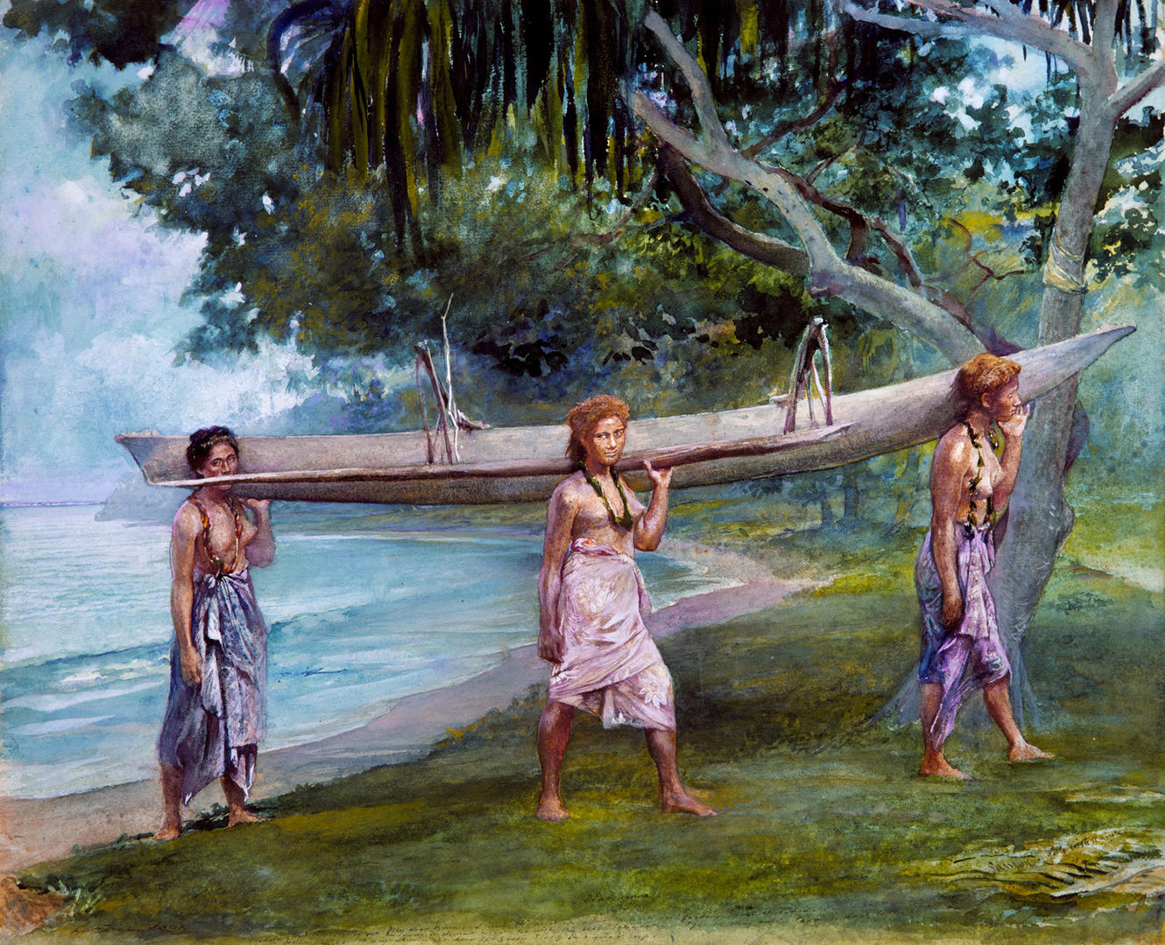 John La Farge (American, 1835–1910). Girls Carrying a Canoe, Vaiala in Samoa, 1891. Watercolor, gouache, and graphite on off-white wove paper, 17 15/16 x 21 7/8 in. (45.6 x 55.6 cm). Purchase, Mrs. Arthur Hays Sulzberger Gift, in memory of Mr. Arthur Hays Sulzberger, 1970 (1970.120)