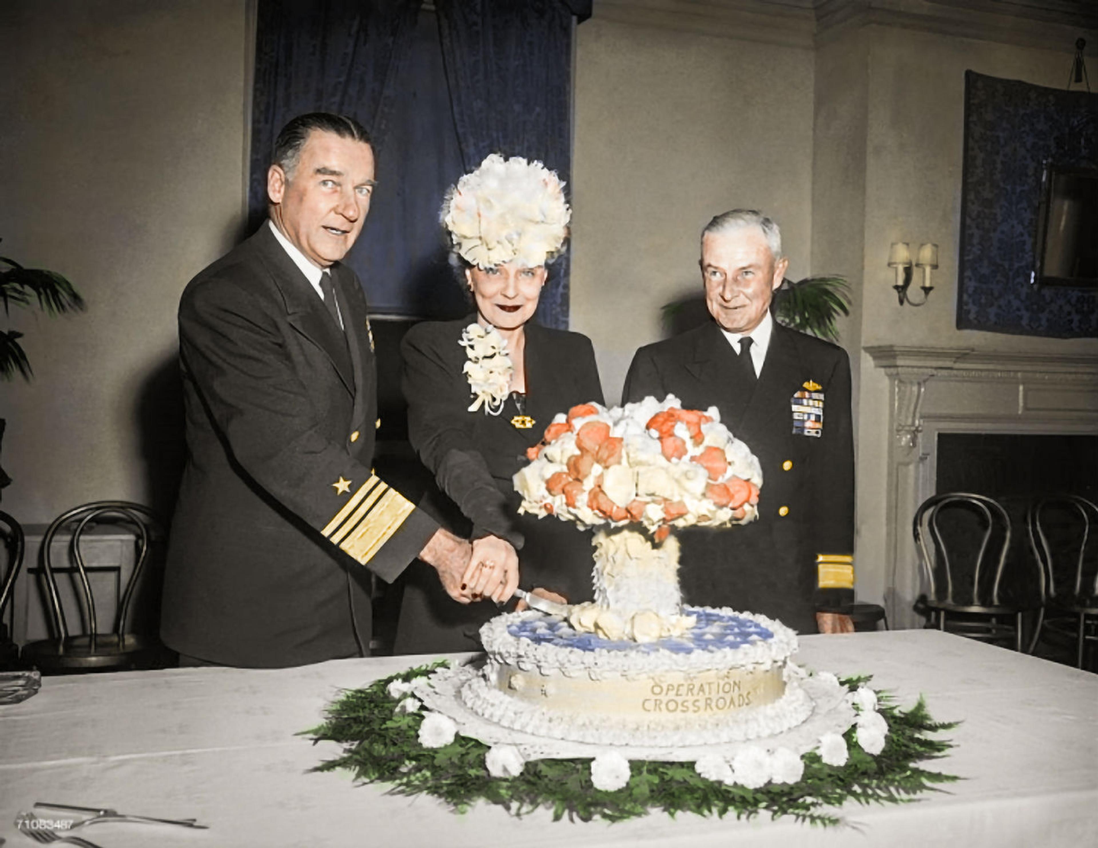 Colorized work of the photograph Admiral Cuts 'Atomic' Cake from Nov. 5, 1946, 3264. Image courtesy Dan Taluapapa McMullin