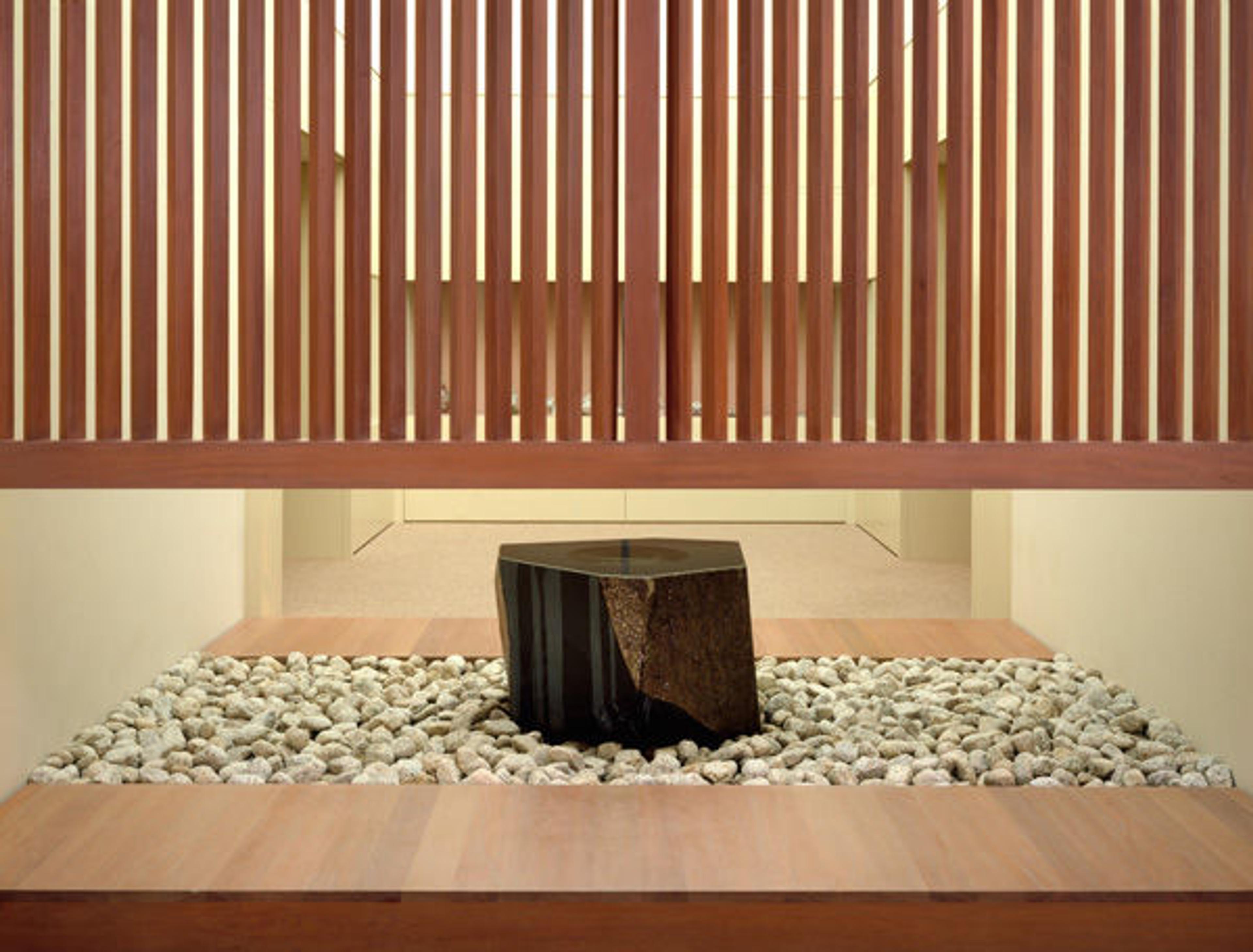 If your phone is off, you'll hear the water gliding over the surface of Isamu Noguchi's Water Stone. Close your eyes and you'll hear the way the water makes an almost imperceptible rushing sound as it slides, the sound of water on rock will slow your heart. Stand, or even sit on the floor, and watch the water make its way down the rough and smooth sides. Listen to the sound it makes as it glides—you'll become attuned to quietness.